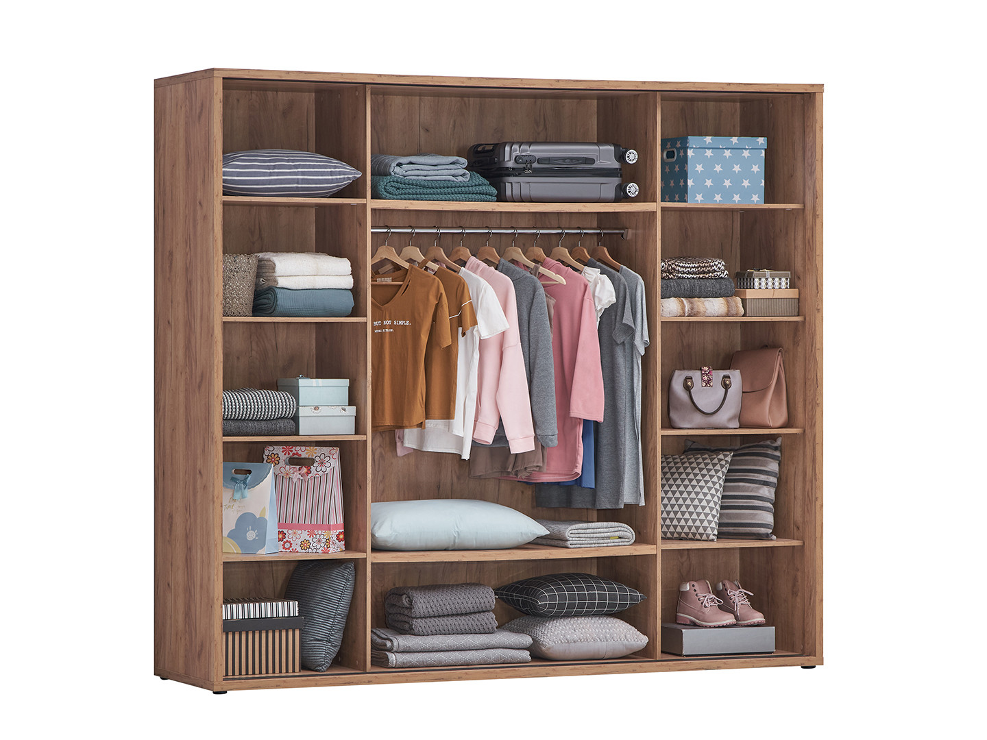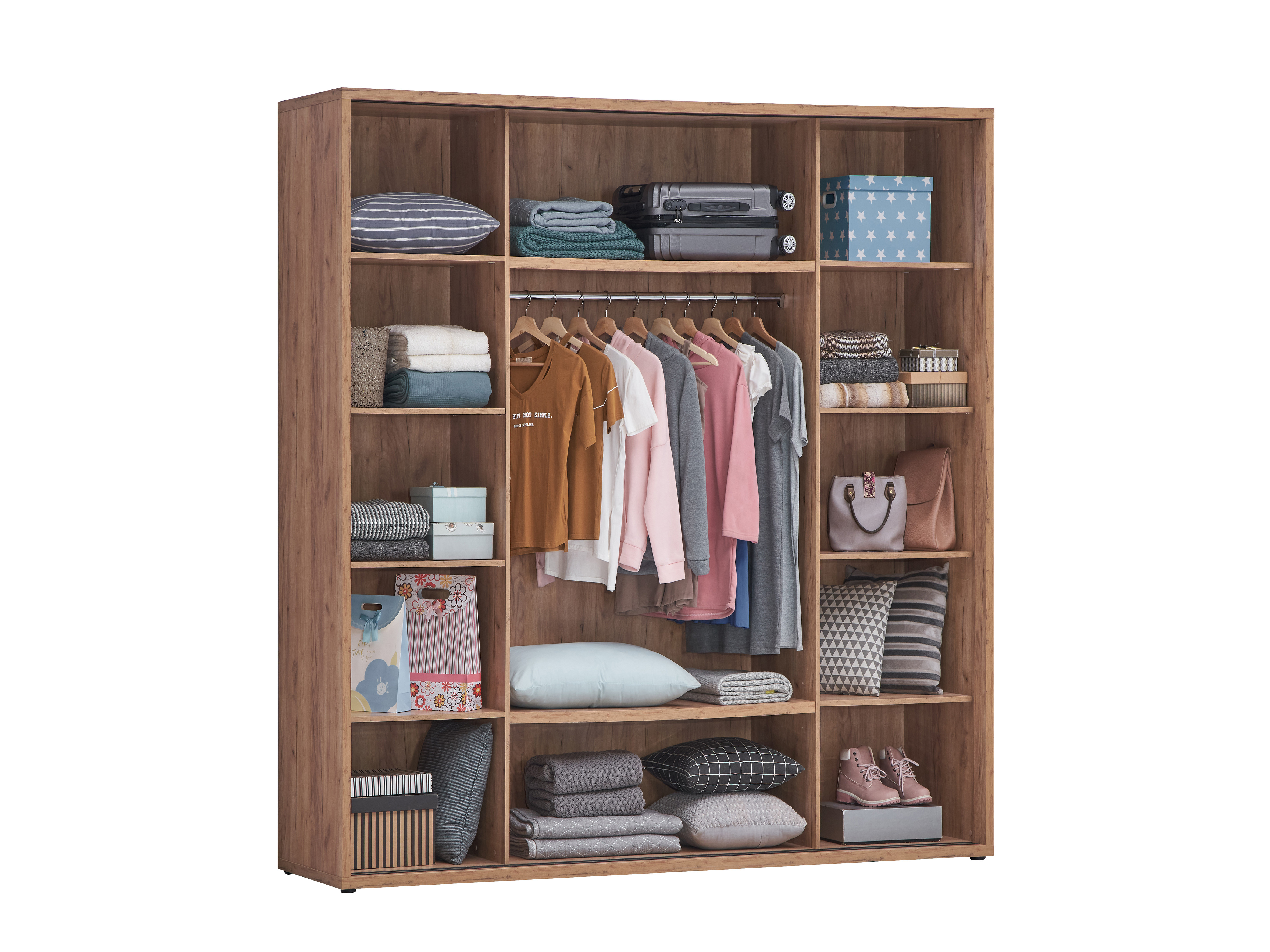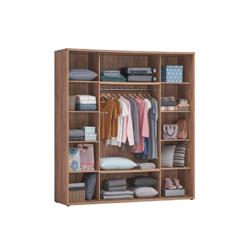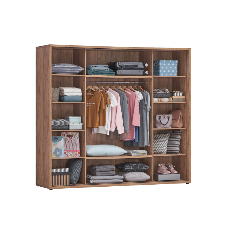 L'aménagement intérieur de l'armoire Erwan a été pensé pour optimiser le rangement de vos vêtements et accessoires. Ses 10 étagères généreuses permettent d'organiser méticuleusement votre dressing : pliages soignés, linge de maison, chaussures ou accessoires trouvent leur place dans un espace structuré et accessible. Cette configuration modulable s'adapte à vos besoins spécifiques et vous permet de personnaliser votre rangement selon vos habitudes vestimentaires. La hauteur sous plafond du meuble maximise la capacité de stockage vertical, un avantage non négligeable pour les garde-robes volumineuses.