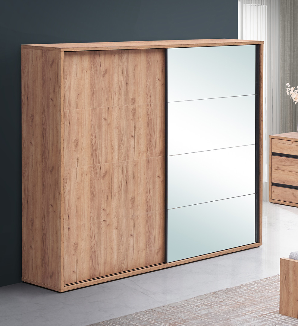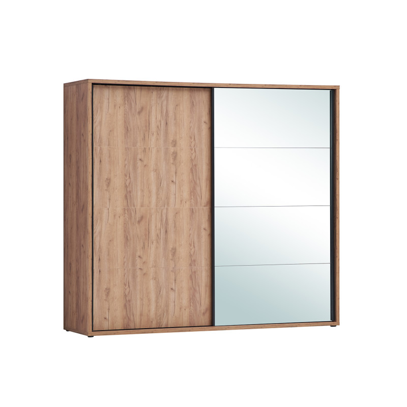Conçue avec des panneaux de particules de première qualité revêtus d'un décor soigné, cette armoire de chambre garantit robustesse et durabilité dans le temps. Le système de portes coulissantes constitue un atout majeur de ce modèle, permettant un gain de place considérable puisqu'aucun débattement n'est nécessaire à l'ouverture. Fini les contraintes d'espace devant le meuble : cette solution astucieuse convient particulièrement aux chambres où chaque centimètre compte. Les deux portes glissent avec fluidité sur leur rail, offrant un accès pratique à l'ensemble de votre garde-robe tout en préservant l'esthétique épurée de la pièce.