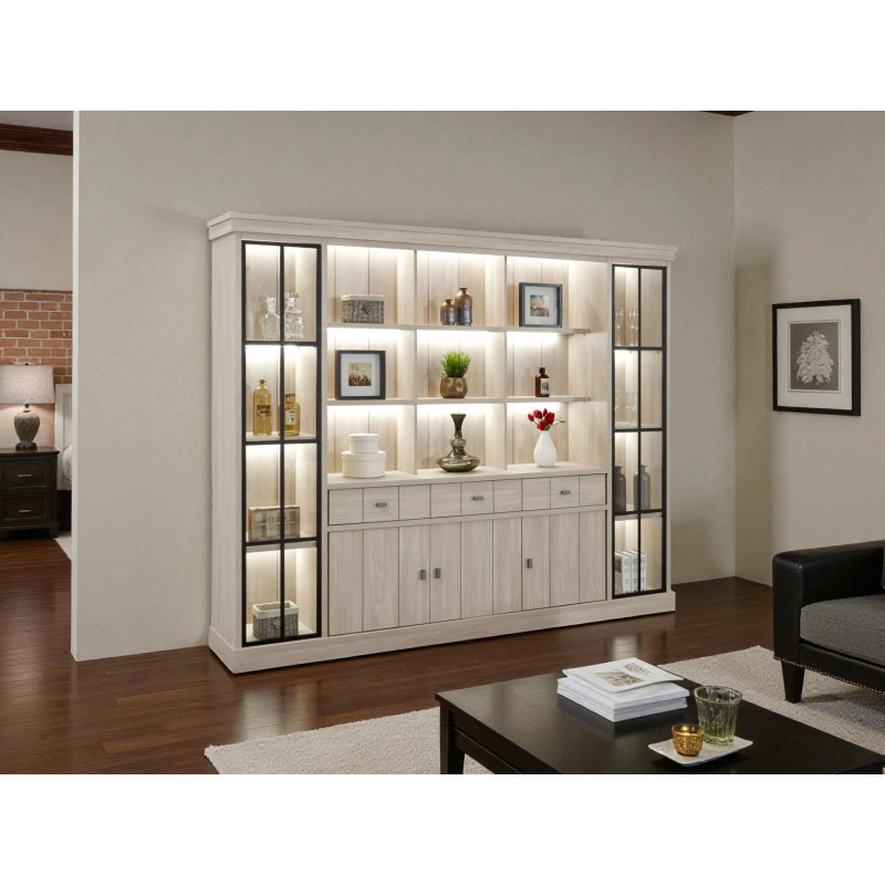 Elle se compose de trois portes pleines comprenant chacune une étagère, de deux portes vitrées comprenant chacune trois étagères avec éclairage Led, de trois tiroirs et de 9 niches de rangement avec éclairage Led.