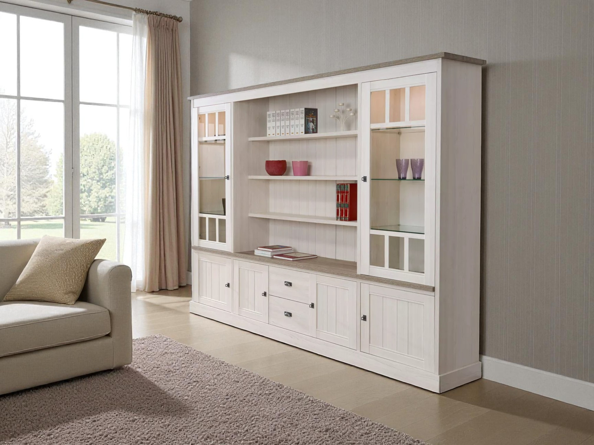 Avec ses dimensions imposantes (259 cm de long, 211 cm de haut et 50 cm de profondeur), elle devient un véritable élément central de votre décoration. Son association de chêne beige et de mélèze lui permet de s’intégrer aussi bien dans un intérieur contemporain que plus classique. Conçue pour durer, elle est dotée de façades en MDF, de portes et étagères en verre sécurit (3 et 6 mm), ainsi que de poignées et charnières métalliques pour une ouverture fluide et résistante. Son design épuré lui permet de trouver sa place aussi bien dans un salon, un bureau qu’en meuble de salle à manger.