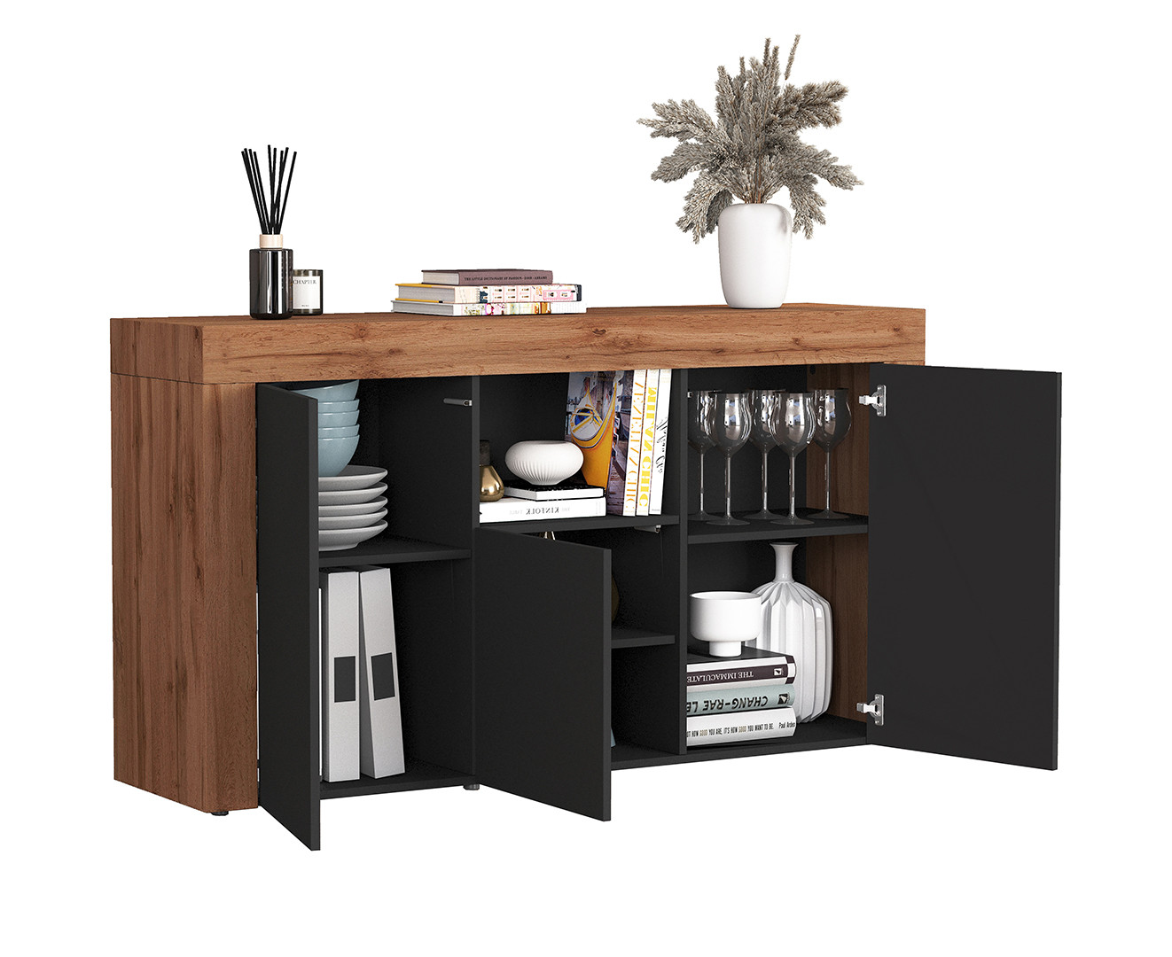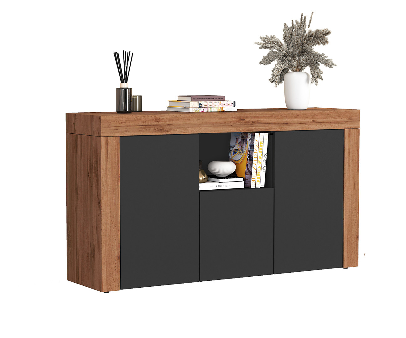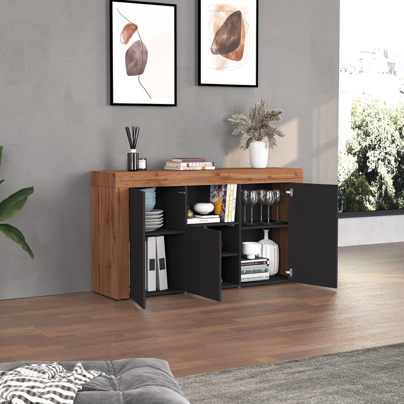 Alliant élégance contemporaine et fonctionnalité, ce buffet/bahut de la marque Deladeco s'impose comme une pièce maîtresse dans votre intérieur. Fabriqué en Italie avec des panneaux de particules mélaminés de première qualité, il affiche des finitions soignées qui lui confèrent un aspect premium indéniable. Son coloris anthracite mat associé au chêne wotan crée un contraste raffiné, parfaitement en phase avec les tendances décoratives actuelles. Avec ses 155 cm de longueur pour 85 cm de hauteur et 40 cm de profondeur, il s'intègre harmonieusement dans une salle à manger ou un salon sans encombrer l'espace.