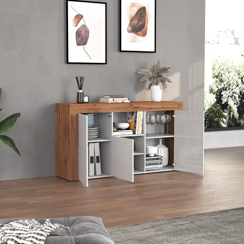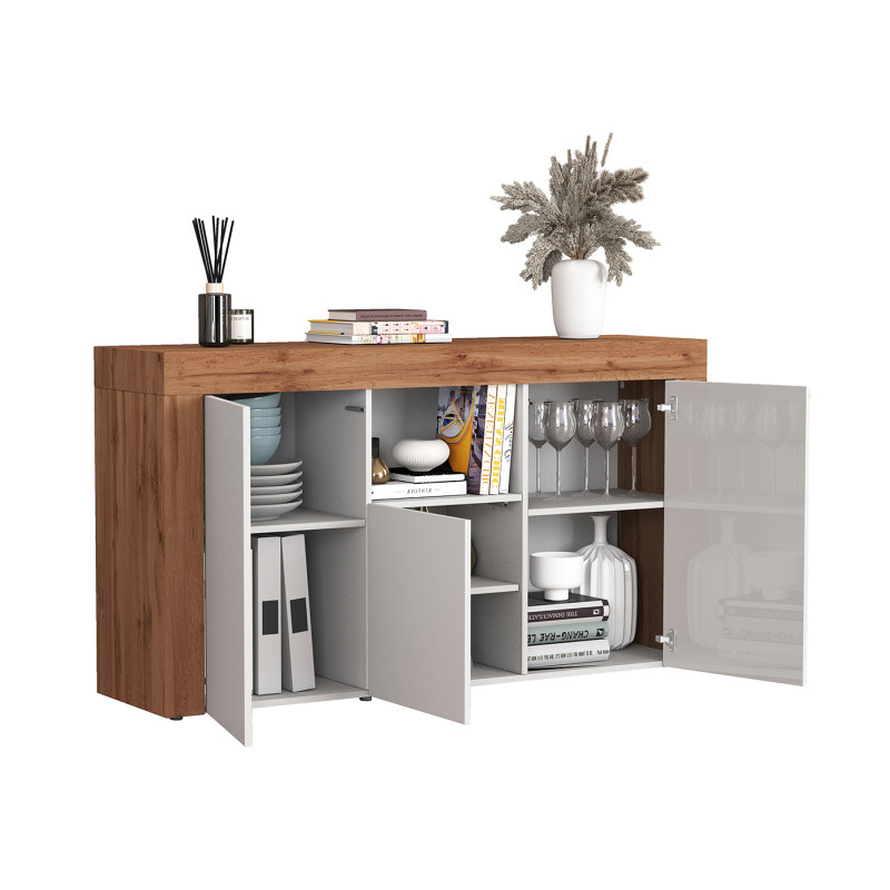 Avec ses 155 cm de longueur, 85 cm de hauteur et 40 cm de profondeur, cette enfilade offre un volume de rangement généreux sans alourdir visuellement l'espace. Ses trois portes battantes s'ouvrent sur des espaces intérieurs spacieux, idéaux pour accueillir vaisselle, nappes, bouteilles ou objets décoratifs. La finition mélaminée garantit une surface lisse, résistante aux rayures du quotidien et facile à entretenir : un simple chiffon doux et humide suffit à lui redonner tout son éclat. Un équilibre parfait entre esthétique contemporaine et praticité au jour le jour.