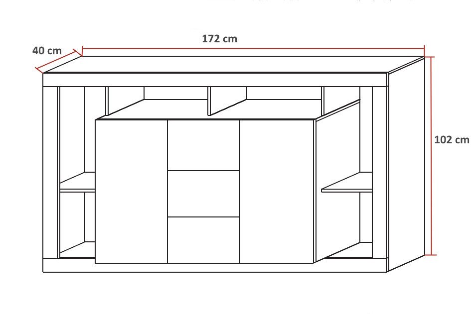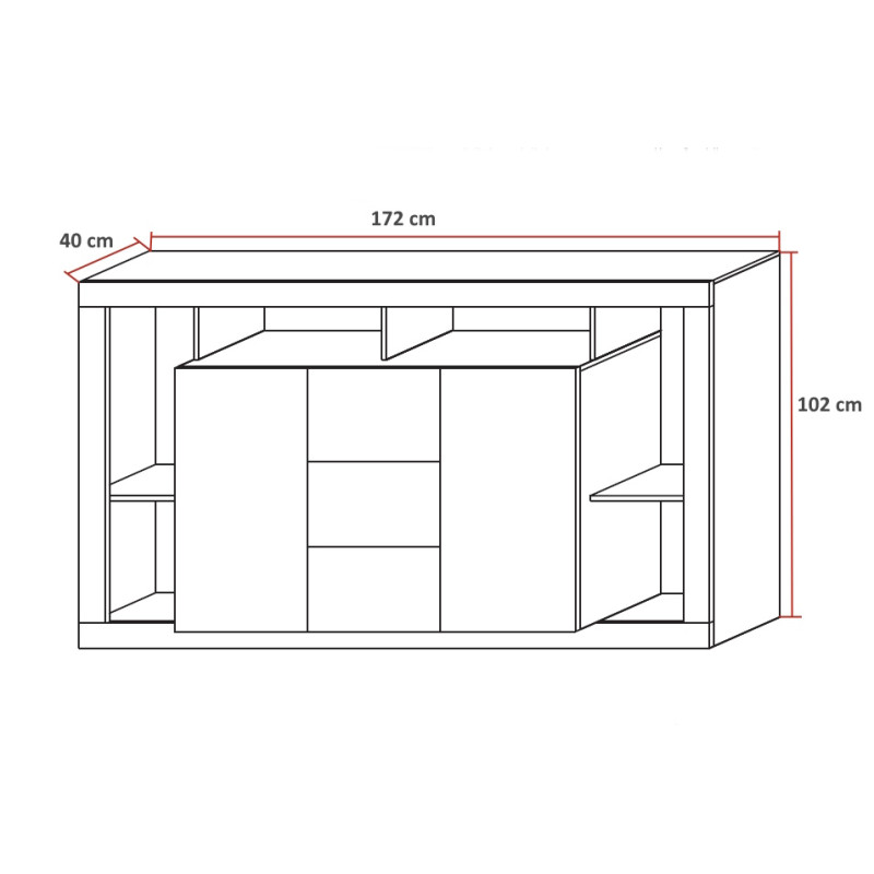 Avec ses dimensions de 172 cm de long, 102 cm de haut et 40 cm de profondeur, ce bahut offre une capacité de rangement optimale tout en conservant une silhouette fine et élégante. Ses deux portes battantes et ses trois tiroirs permettent de ranger aisément vaisselle, linge de table ou objets du quotidien. Le système d’ouverture avec charnières en métal et technologie Soft Closing garantit un confort d’utilisation silencieux et durable, tout en préservant la qualité du meuble dans le temps. Le pied arrière en PVC assure une stabilité parfaite, même sur des sols irréguliers, tandis que les poignées en métal ajoutent une note de modernité subtile.