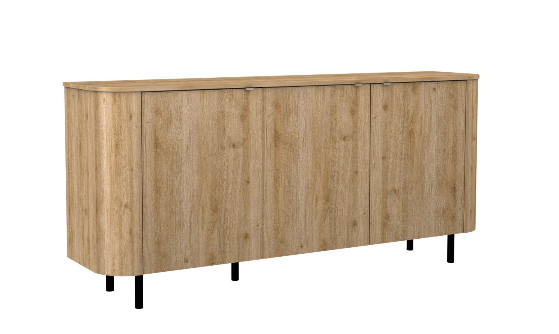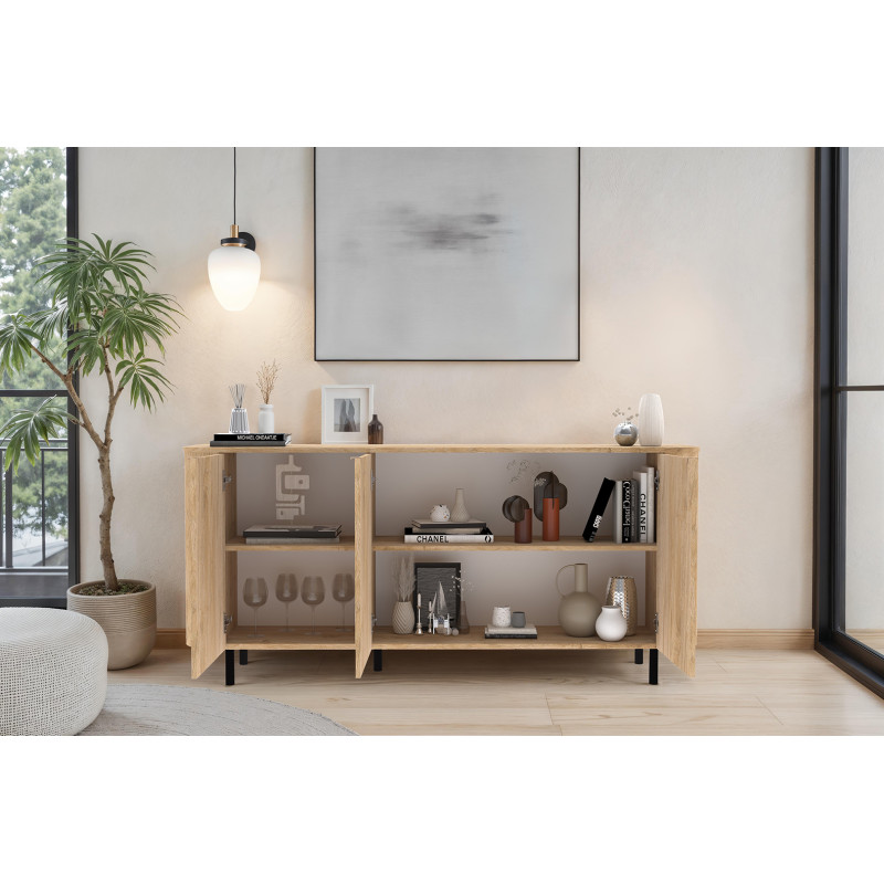 Pratique et esthétique, cette enfilade se compose de trois portes battantes dotées de charnières métalliques robustes et de poignées en métal assorties. Chaque compartiment intérieur est spacieux et fonctionnel, permettant d’organiser facilement vos effets personnels. Grâce à un système d’ouverture fluide et discret, le Marley allie confort d’utilisation et durabilité. Son design minimaliste et ses lignes géométriques s’accordent parfaitement avec d’autres meubles modernes, créant un ensemble harmonieux et sophistiqué dans votre salle à manger.