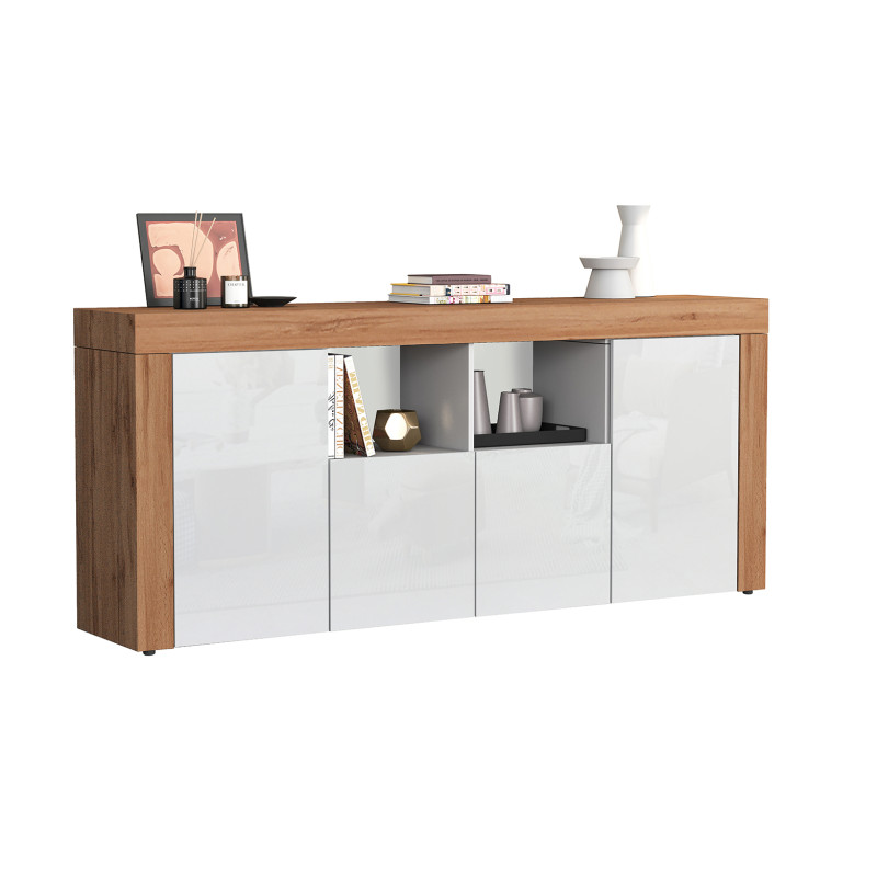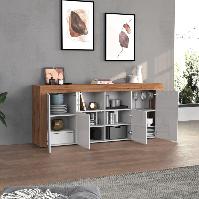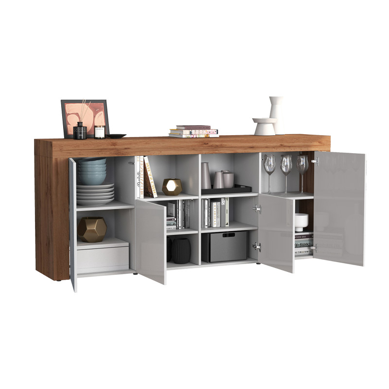 Apporter élégance et fonctionnalité à votre intérieur n'a jamais été aussi simple grâce à ce buffet/bahut contemporain signé Deladeco, fabriqué en Italie avec un soin particulier apporté à la qualité des matériaux. Sa robe bicolore blanc brillant et chêne wotan lui confère un caractère affirmé, capable de s'intégrer aussi bien dans un intérieur épuré que dans un espace à l'atmosphère chaleureuse. Avec ses 200 cm de longueur et ses 85 cm de hauteur, il s'impose naturellement comme une pièce maîtresse de la pièce à vivre, offrant une présence visuelle forte sans jamais alourdir l'ambiance.