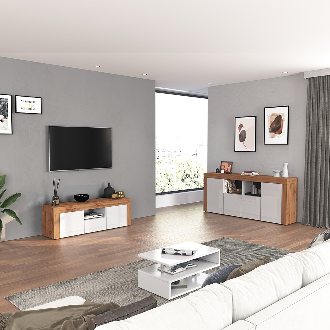 | Meuble TV contemporain 155 cm blanc brillant/chêne wotan Neros | | Longueur: 155 cm Hauteur: 51 cm Profondeur: 40 cm | En stock 48 à 72h | 459 € 99 | ||