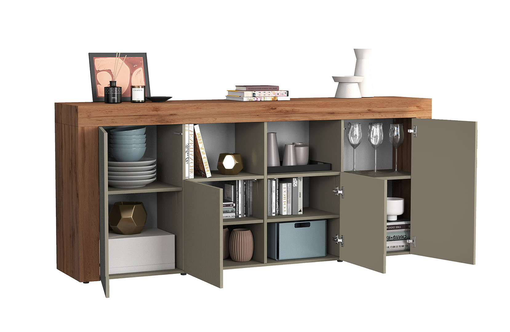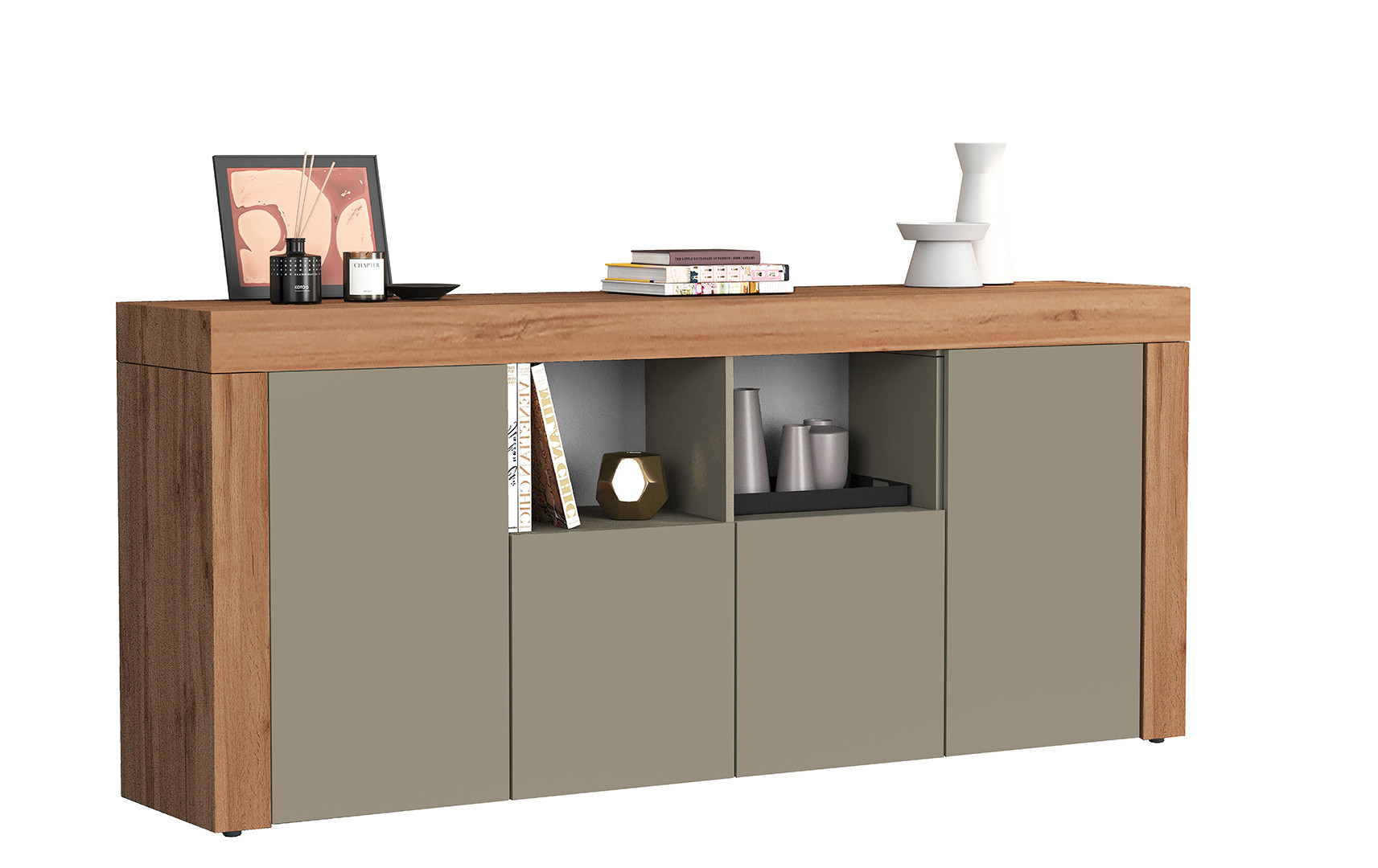 Véritable atout de décoration, ce meuble de salle à manger conjugue usage pratique et ambiance raffinée. Son plateau supérieur dégagé constitue une surface idéale pour exposer des objets décoratifs, des luminaires ou encore des accessoires de table. L'alliance subtile du taupe et du chêne wotan crée un équilibre visuel chaleureux et intemporel, en parfaite harmonie avec les tendances actuelles de la décoration d'intérieur. Ce buffet italien incarne à merveille l'art de vivre contemporain, alliant fonctionnalité et raffinement dans un seul et même meuble.