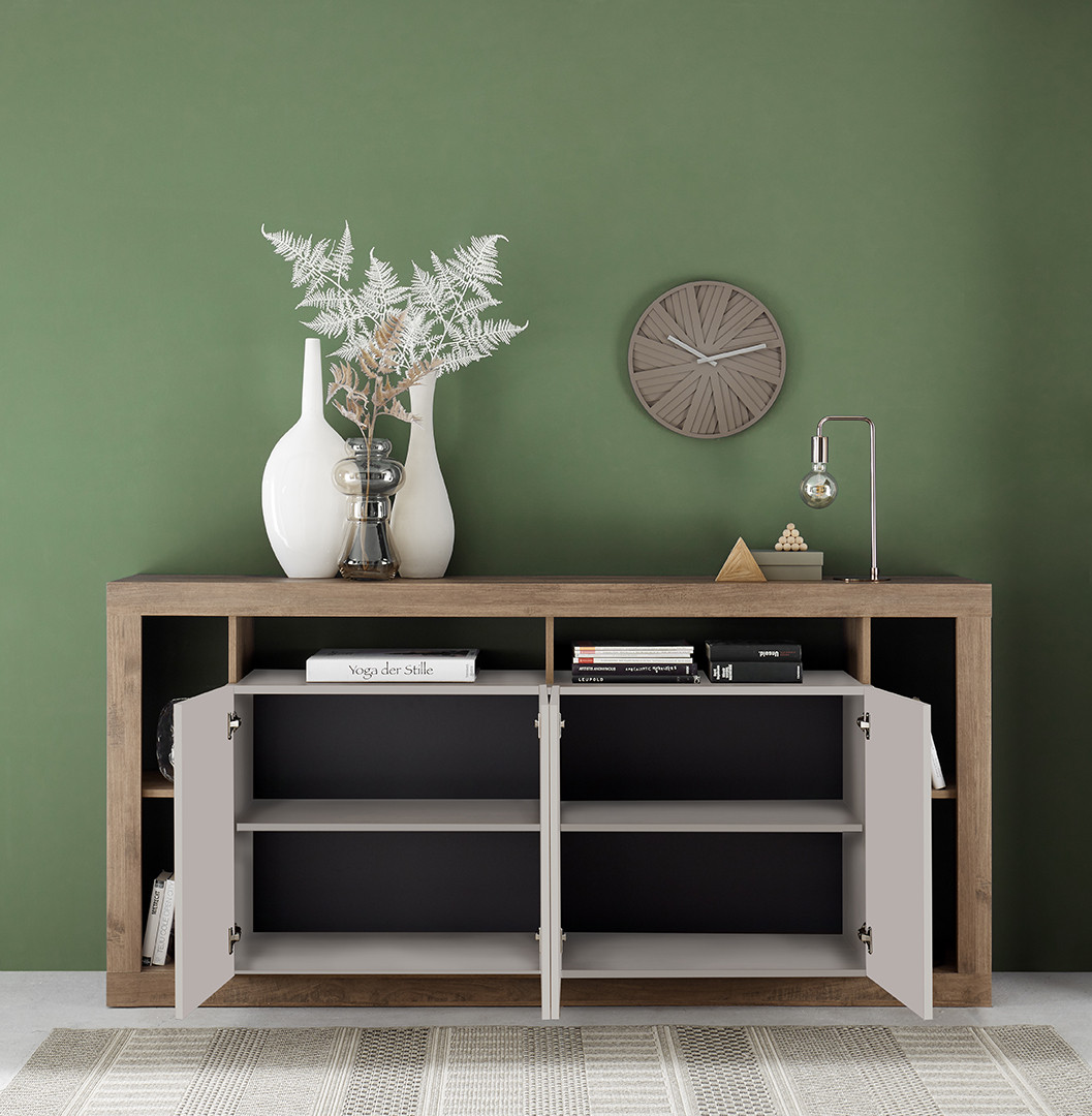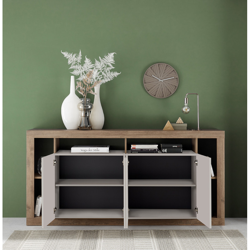 Apportez une touche de raffinement à votre intérieur avec le magnifique buffet/bahut contemporain Dominika de la marque Vivabita. Fabriqué en Italie, ce meuble incarne à la perfection l’élégance du design européen alliée à une grande fonctionnalité. Son coloris mercure/cachemire s’intègre harmonieusement dans une décoration moderne, tout en ajoutant une note douce et chaleureuse. Conçu pour un usage particulier, ce bahut/buffet séduit par ses lignes épurées, sa finition mélaminée de qualité et ses poignées métalliques raffinées. Avec ses quatre portes battantes et son système Soft Closing, il allie confort d’utilisation et robustesse.