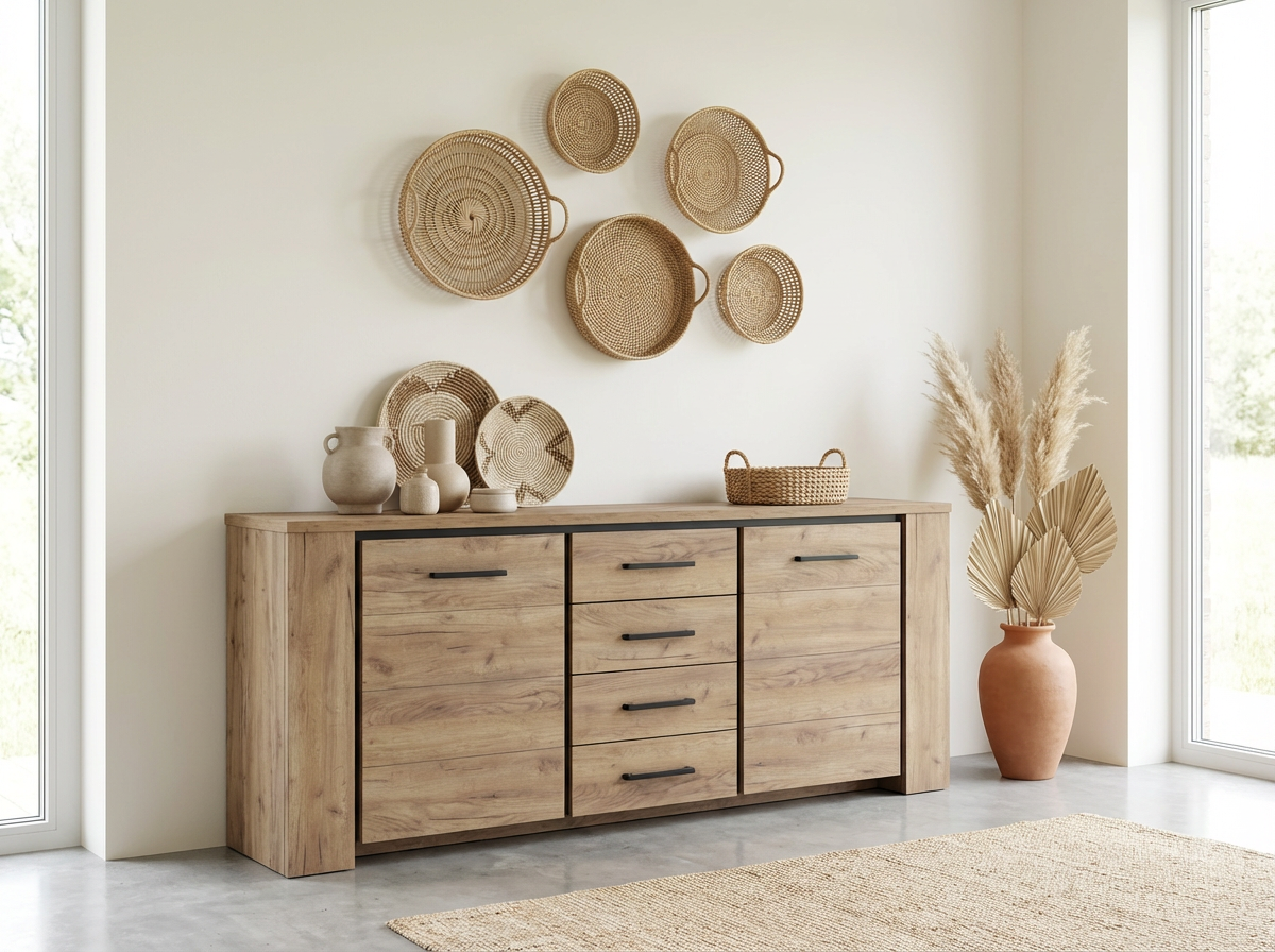 Mais ce n’est pas tout ! En plus de son allure élégante, ce meuble de rangement est un véritable jeu d’enfant à entretenir. Un chiffon doux et un peu de savon neutre suffisent pour préserver l’éclat de son décor en chêne français. Ce bahut est livré en deux colis (93 kg au total) pour faciliter son transport et son montage, avec une notice claire pour une installation rapide et sans prise de tête. Vous voulez du pratique ? Ce bahut moderne et contemporain est fait pour vous !
