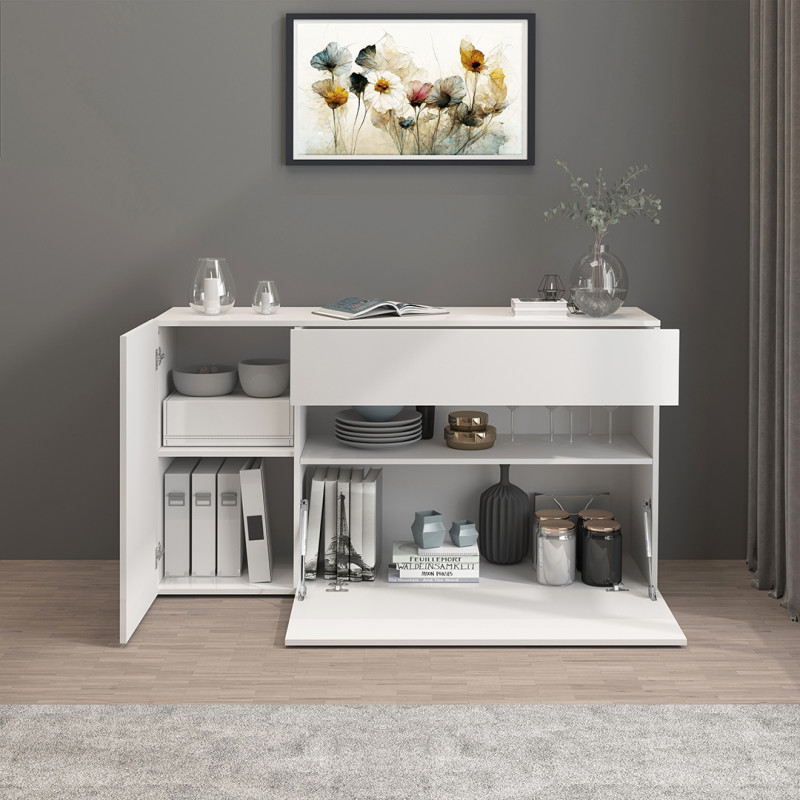 Côté rangement, ce buffet a été pensé pour allier praticité et esthétisme. Il dispose de 2 portes battantes et d'un tiroir, offrant ainsi de nombreuses possibilités d'organisation pour votre vaisselle, vos couverts ou vos objets de décoration. Sa finition mélaminée soigneusement travaillée résiste aux rayures du quotidien, tandis que son entretien s'avère des plus simples : un chiffon doux et humide suffit à le maintenir dans un état impeccable. Un avantage non négligeable pour les foyers actifs qui privilégient à la fois le style et la facilité d'usage.