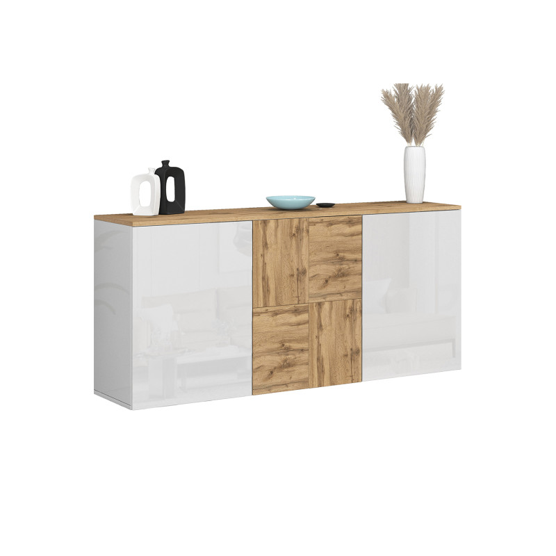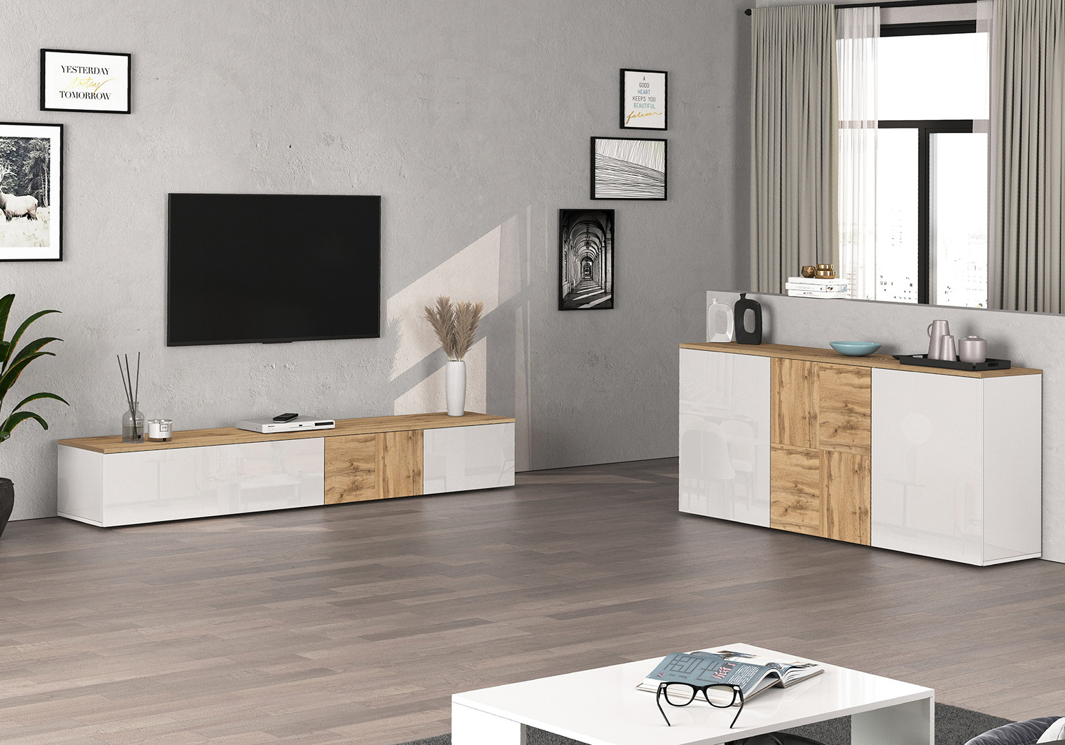 | Buffet/bahut moderne 200 cm blanc brillant/chêne wotan Isayane | | Longueur: 200 cm Hauteur: 70 cm Profondeur: 35 cm | En stock 48 à 72h | 395 € 00 | ||