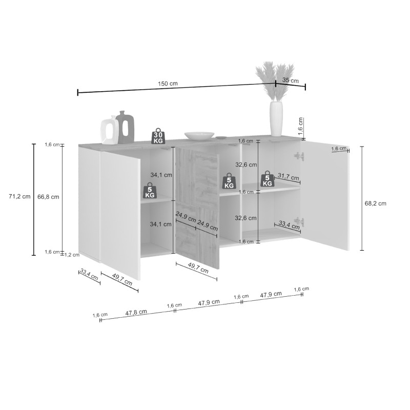 Avec ses 150 cm de longueur, 70 cm de hauteur et 35 cm de profondeur, ce bahut offre un volume de rangement généreux sans pour autant empiéter sur l'espace de vie. Sa structure robuste est réalisée en panneaux de particules mélaminés de première qualité de 16 mm d'épaisseur, garantissant une solidité durable dans le temps. Ses trois portes battantes s'ouvrent avec fluidité et permettent d'organiser l'intérieur selon vos besoins, qu'il s'agisse de vaisselle, de linge de table ou de tout autre accessoire du quotidien.