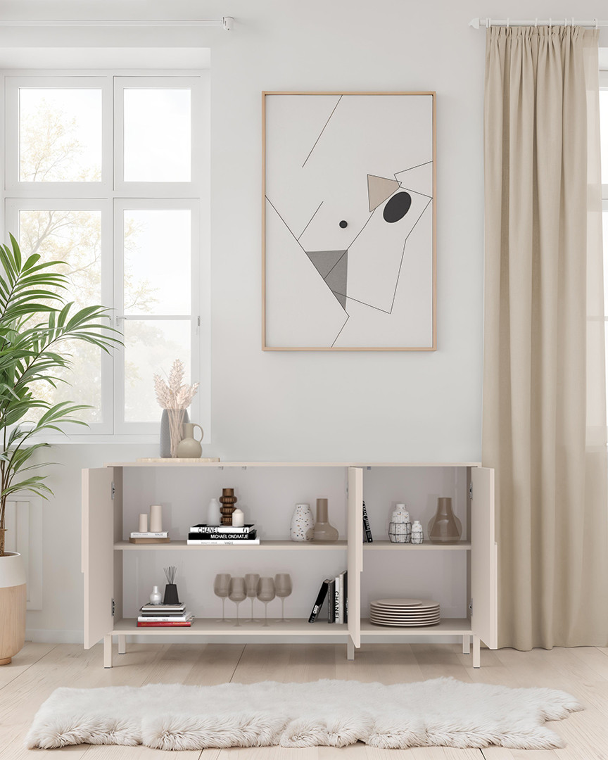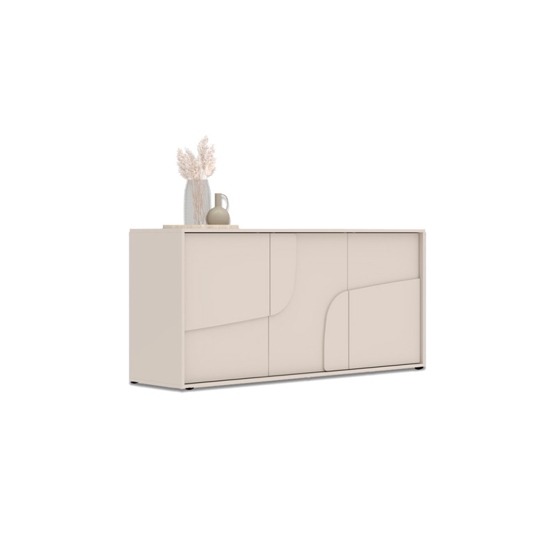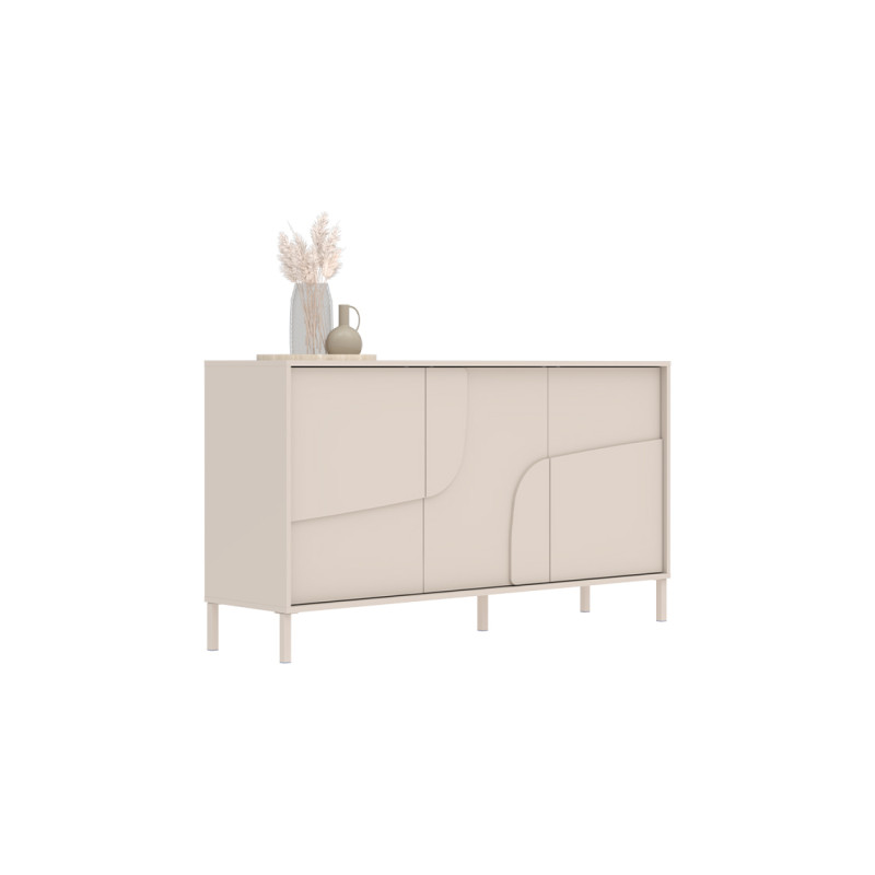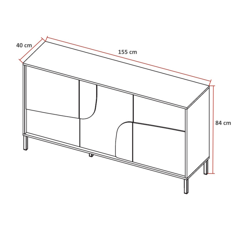 Fabriqué en Italie, ce bahut reflète une conception soignée et une robustesse exemplaire. Sa structure en panneaux de particules mélaminés de 16 mm, agrémentée de bugnes moulurées appliquées de 10 mm, garantit stabilité et longévité. Le piétement, disponible au choix en métal de 14 cm de hauteur ou en PVC de 2 cm, permet de personnaliser le style du meuble selon vos envies et votre décoration intérieure. Ses trois portes battantes s’ouvrent avec un système Push To Open moderne et pratique, supprimant ainsi la nécessité de poignées visibles pour un rendu encore plus minimaliste.