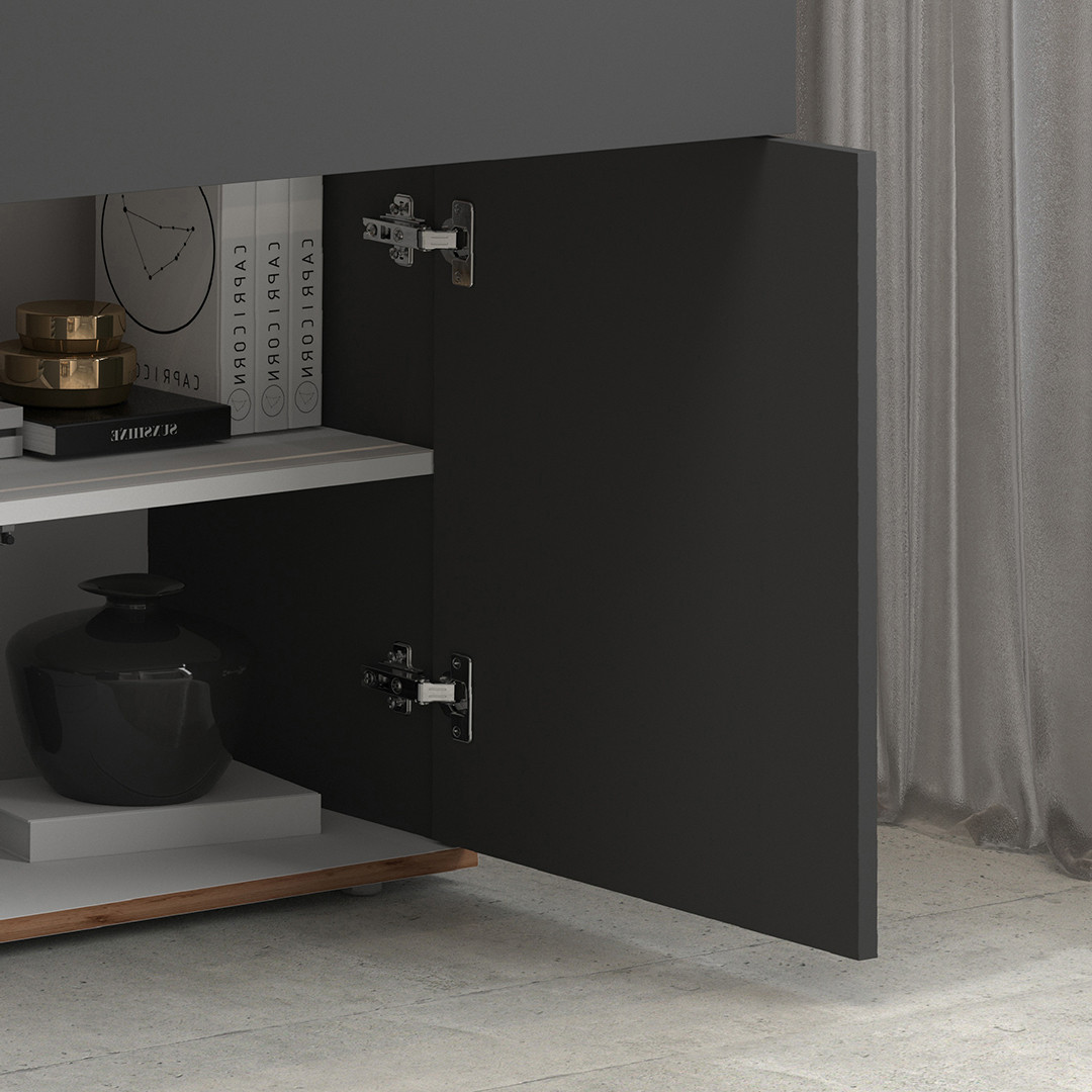 Du côté de la praticité, cette enfilade se distingue par son système d'ouverture Push To Open, qui permet d'actionner les 4 portes battantes et les 2 tiroirs d'une simple pression du doigt, sans poignée apparente. Ce choix technique renforce l'aspect épuré de l'ensemble et facilite l'accès au rangement au quotidien. L'espace intérieur généreusement dimensionné permet d'accueillir vaisselle, linge de table, appareils électroménagers ou encore documents, selon vos besoins.