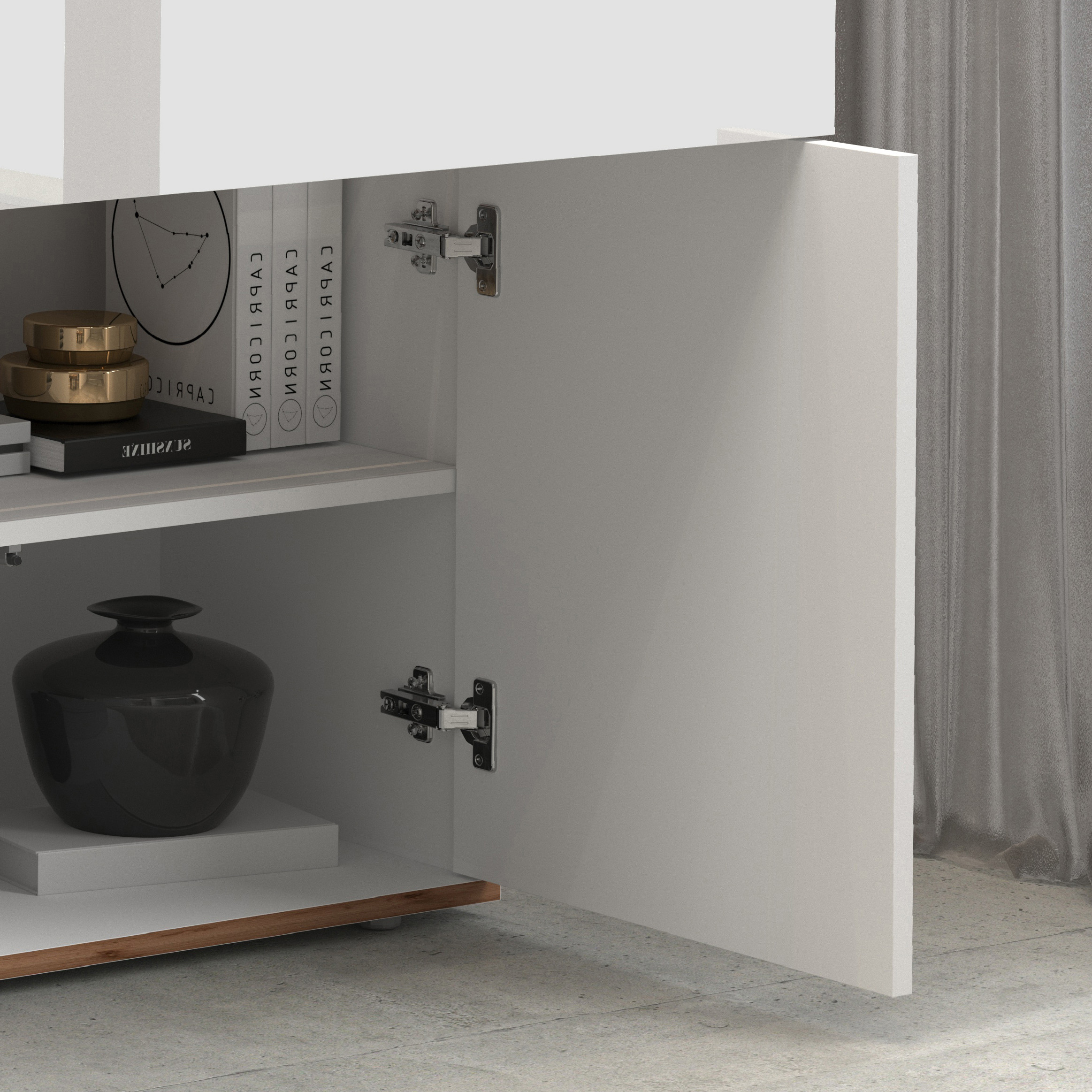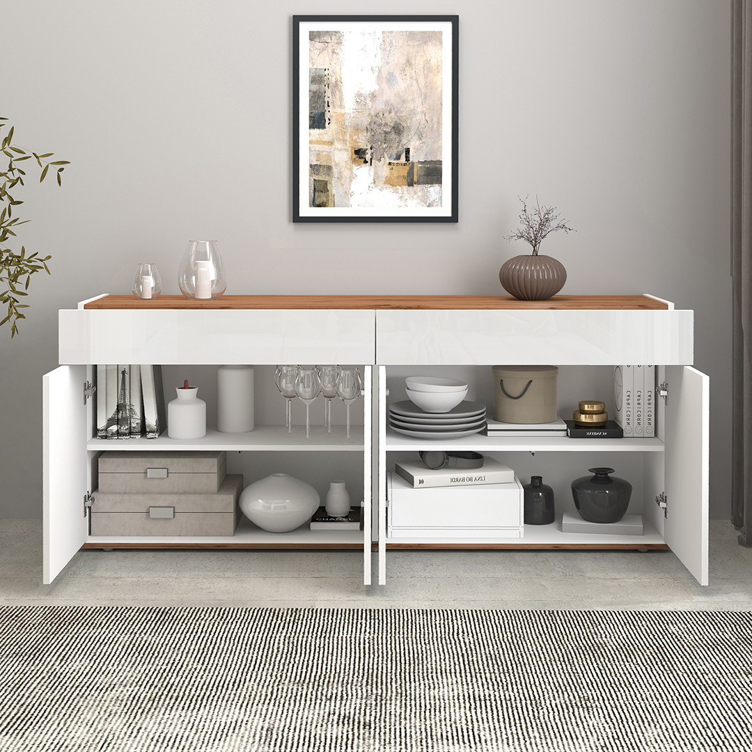 Côté praticité, ce meuble de rangement se distingue par son organisation intérieure particulièrement bien pensée : il dispose de 4 portes battantes et de 2 tiroirs offrant une capacité de stockage généreuse pour ranger vaisselle, linge de table, ou objets du quotidien. Le système d'ouverture Push To Open, sans poignée apparente, apporte une esthétique épurée et une facilité d'utilisation appréciable au quotidien. Ce mécanisme moderne contribue à l'aspect minimaliste et soigné de l'ensemble, parfaitement dans l'air du temps.