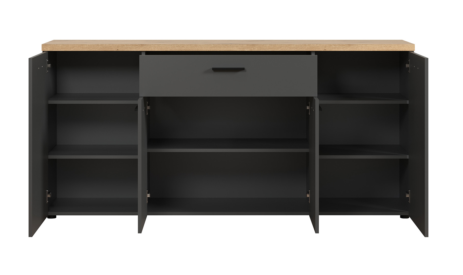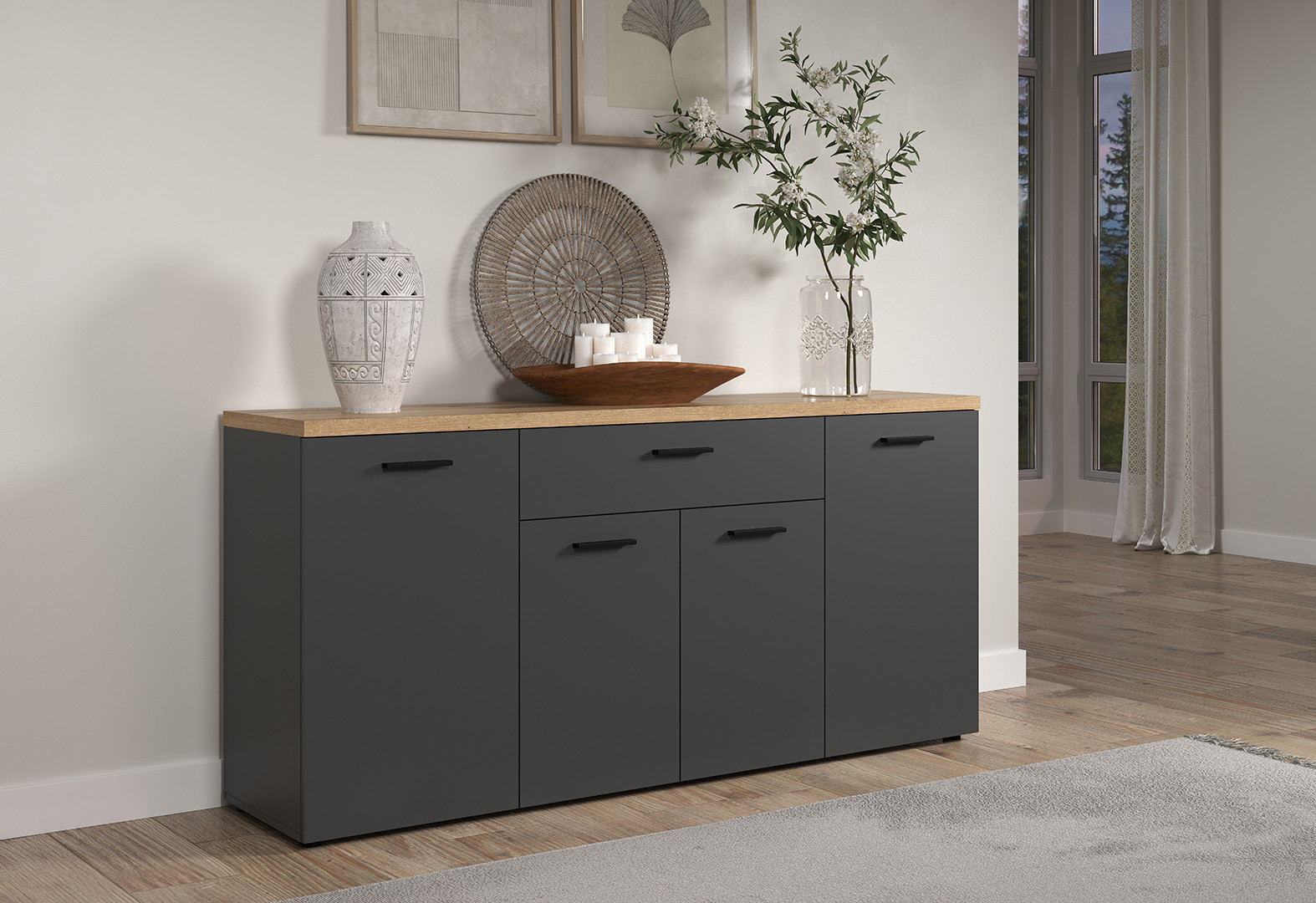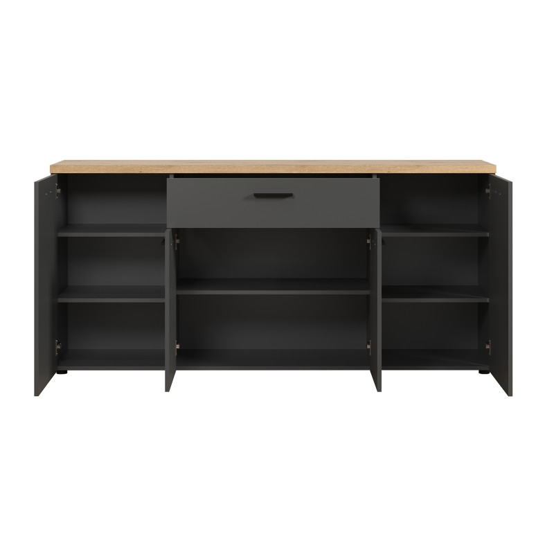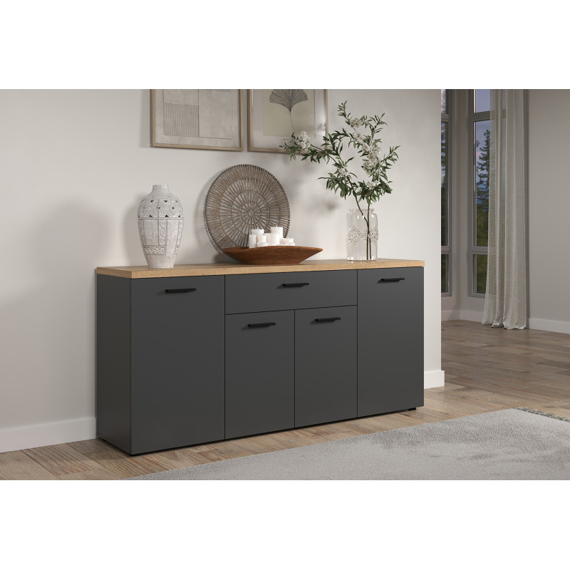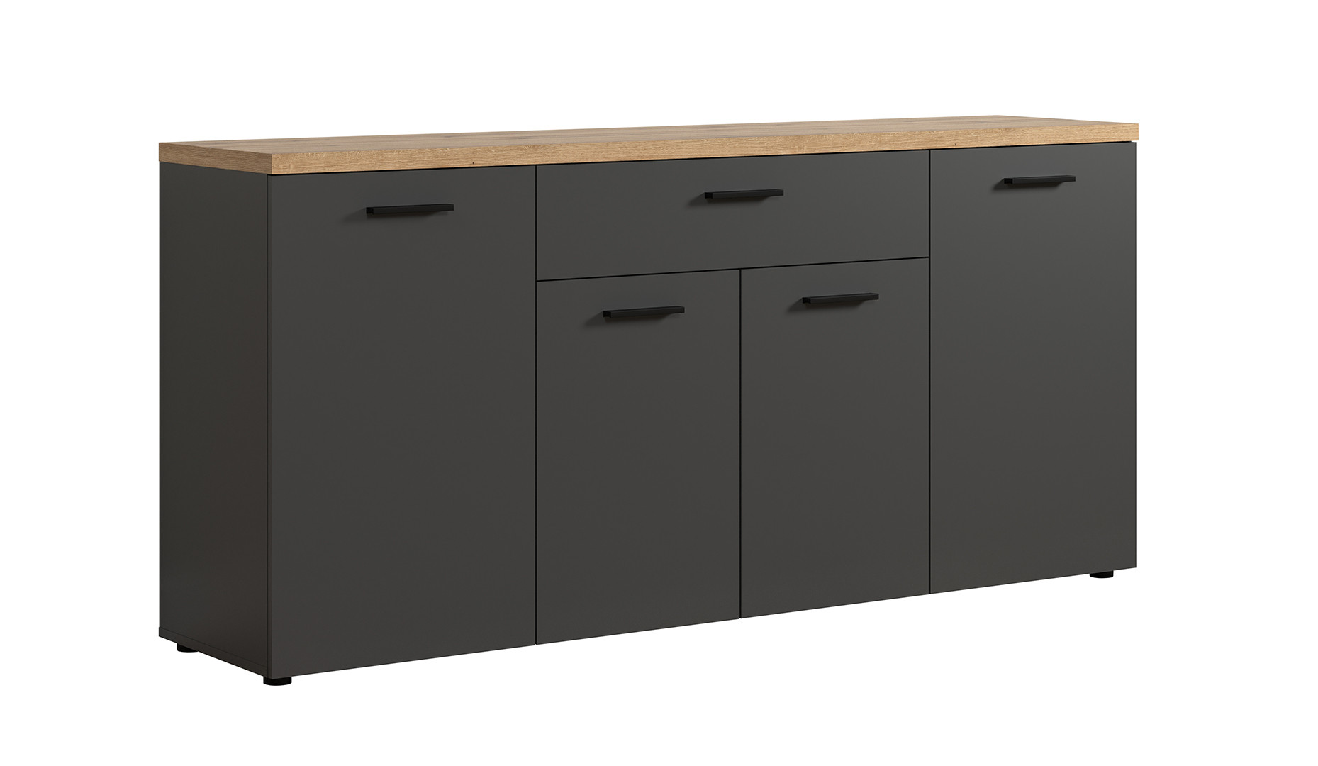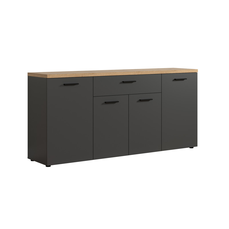 Le Buffet/bahut moderne 180 cm anthracite/chêne Baggy de la marque Deladeco incarne une esthétique actuelle, pensée pour les intérieurs au style moderne et épuré. Conçu pour un usage particulier et fabriqué en Europe, il allie une silhouette soignée à des matériaux fiables. Au cœur de sa structure, des panneaux de particules mélaminés de première qualité assurent robustesse et durabilité, tandis que ses poignées noires en PVC apportent une touche graphique élégante. Ce modèle se distingue également par sa capacité à s’intégrer harmonieusement dans votre salle à manger, devenant ainsi un buffet/bahut qui séduit autant par son design que par sa fonctionnalité. Pour une sélection encore plus vaste, découvrez aussi notre bahut/buffet.