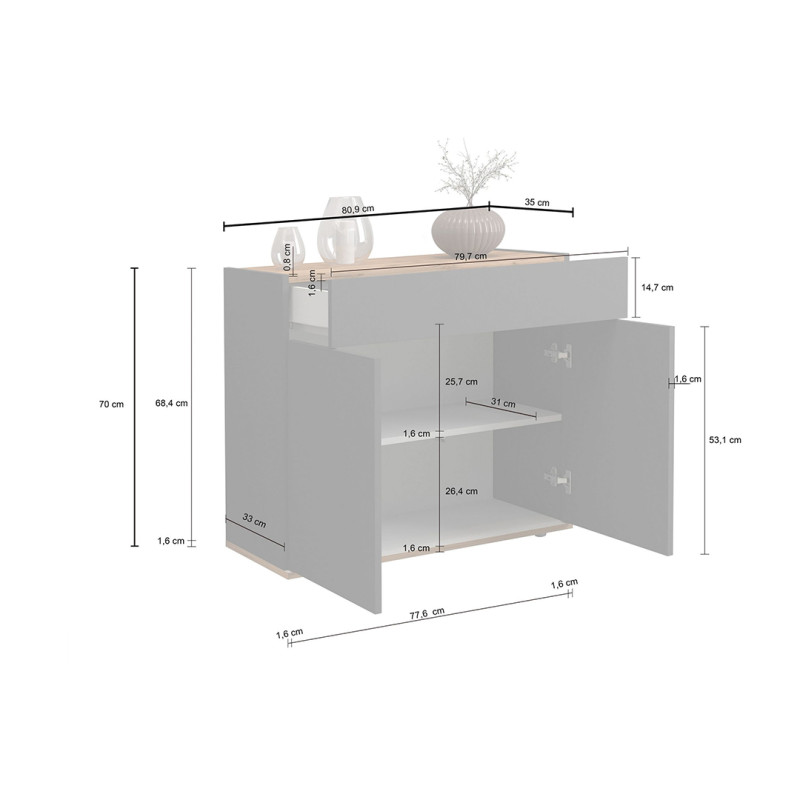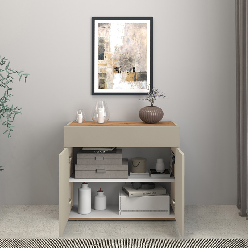 En termes de rangement, ce meuble de rangement se révèle particulièrement bien pensé avec ses 2 portes battantes et son tiroir central, offrant ainsi différents espaces de stockage pour vaisselle, nappes, couverts ou encore bouteilles. Le système d'ouverture Push To Open, sans poignée apparente, confère à l'ensemble une ligne épurée et résolument moderne, en parfaite cohérence avec les tendances déco actuelles. Chaque détail a été soigné pour conjuguer fonctionnalité et esthétisme au service de votre intérieur.