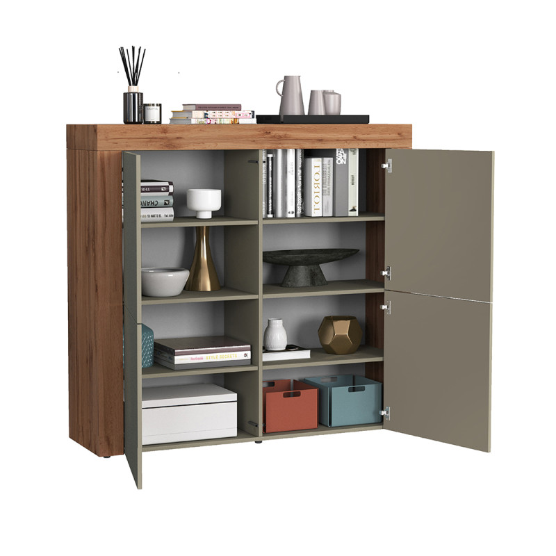 Apportez une touche de raffinement moderne à votre pièce de vie avec ce vaisselier et argentier au design contemporain signé Deladeco. Fabriqué en Italie avec un soin particulier apporté à la qualité des matériaux, il se distingue par sa palette de couleurs taupe et chêne wotan, une association subtile qui marie la chaleur du bois et la sobriété d'un ton neutre. Ce meuble s'intègre naturellement dans les intérieurs actuels en quête d'harmonie visuelle et de fonctionnalité, tout en apportant une identité affirmée à votre espace repas.