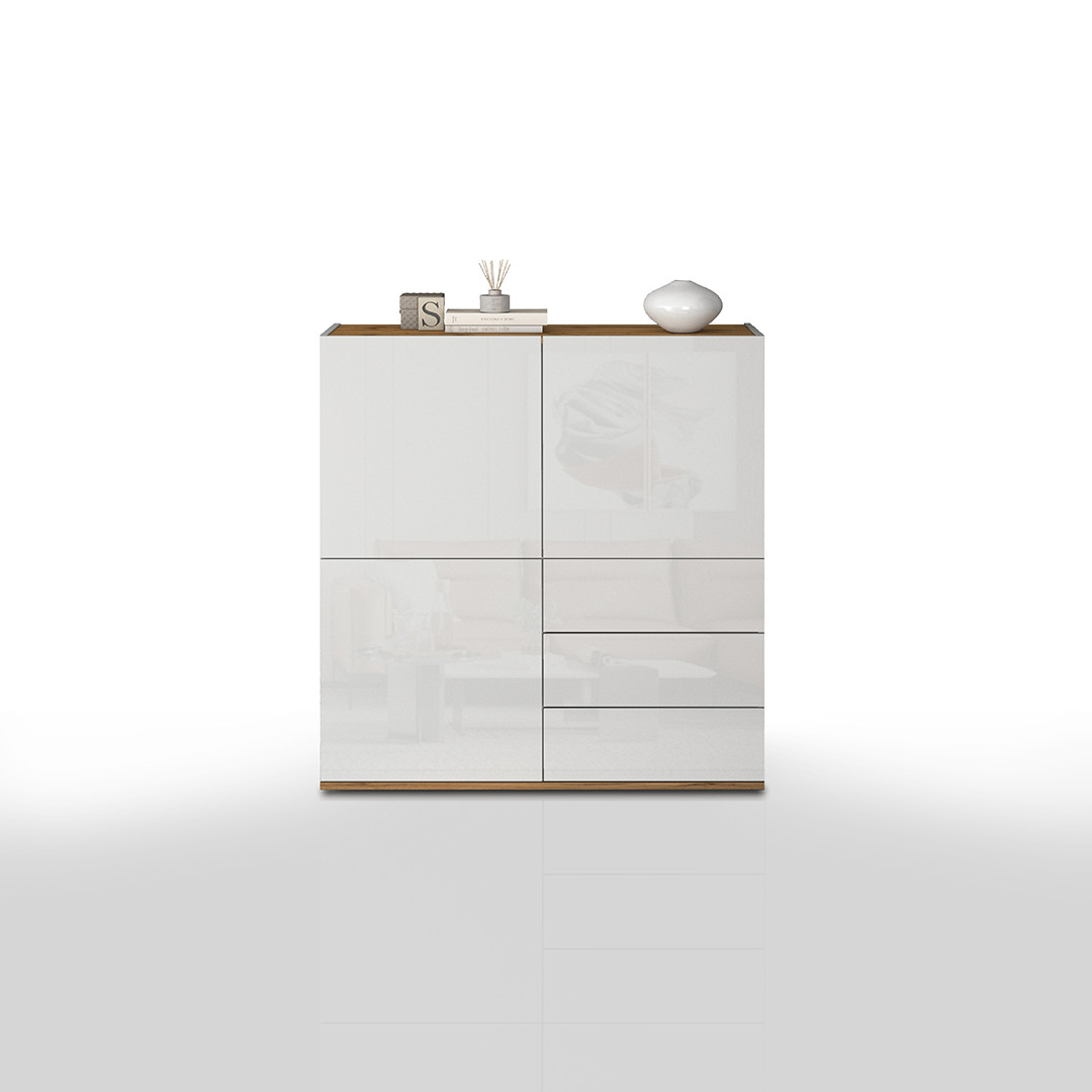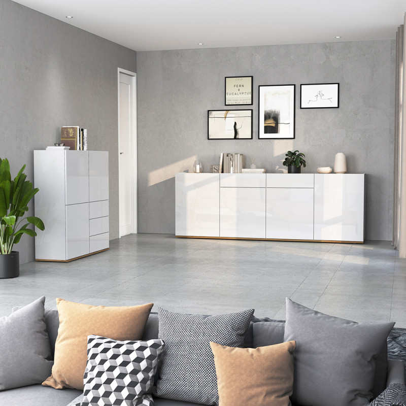 Côté dimensions, ce meuble se distingue par sa silhouette élancée : 102 cm de longueur, 110 cm de hauteur et 35 cm de profondeur. Cette enfilade au format généreux offre une capacité de rangement optimale sans empiéter sur l'espace de votre pièce. Sa structure est constituée de panneaux de particules mélaminés de première qualité en 16 mm, avec un corps blanc mat et des façades blanc brillant qui reflètent la lumière et apportent une touche de luminosité à votre intérieur.