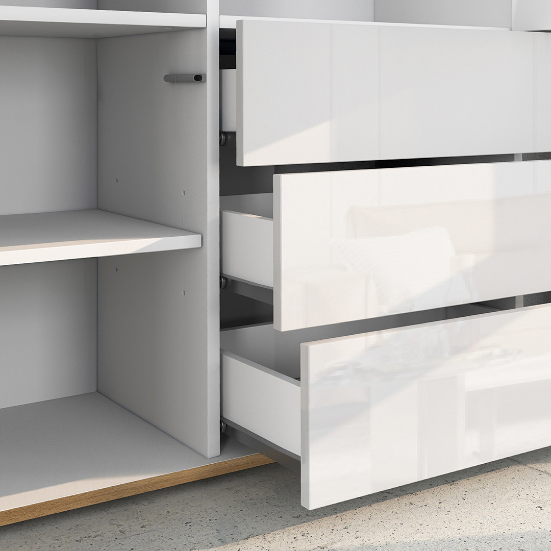 L'ergonomie est au cœur de la conception de ce meuble de rangement élaboré avec soin. Il dispose de 2 portes battantes et de 3 tiroirs, tous équipés d'un système d'ouverture Push To Open : fini les poignées apparentes, place à un design lisse et minimaliste. Le piétement en PVC et la finition mélaminée garantissent une durabilité dans le temps, tandis que l'entretien reste simplissime grâce à un simple chiffon doux et humide.