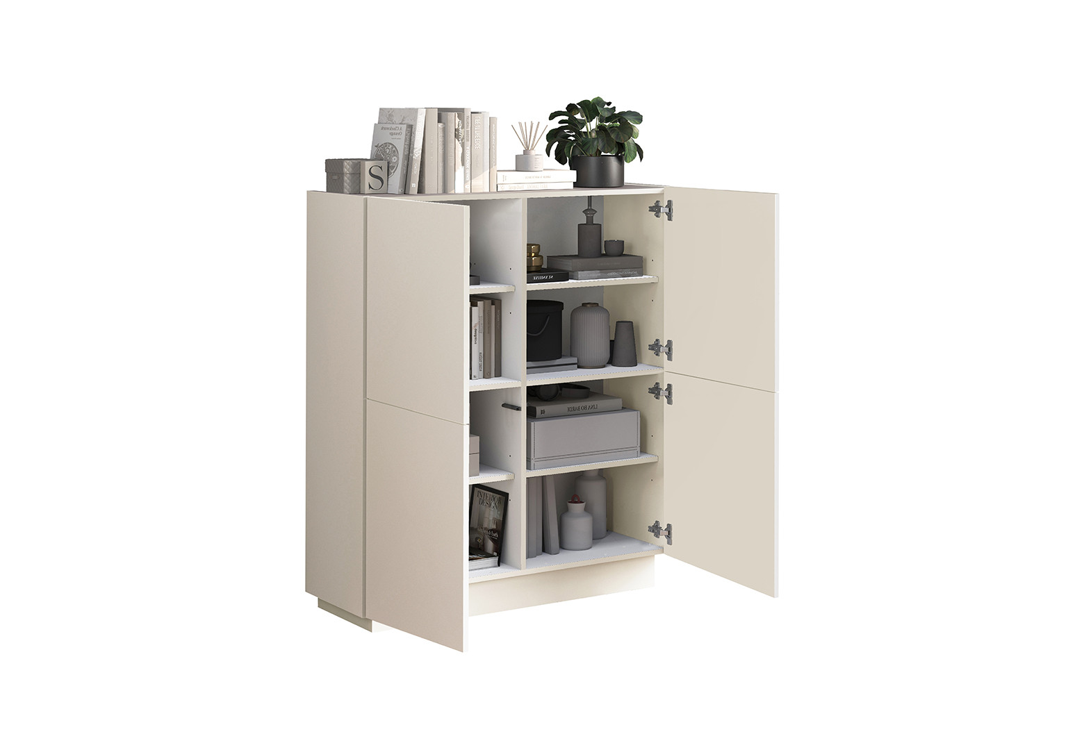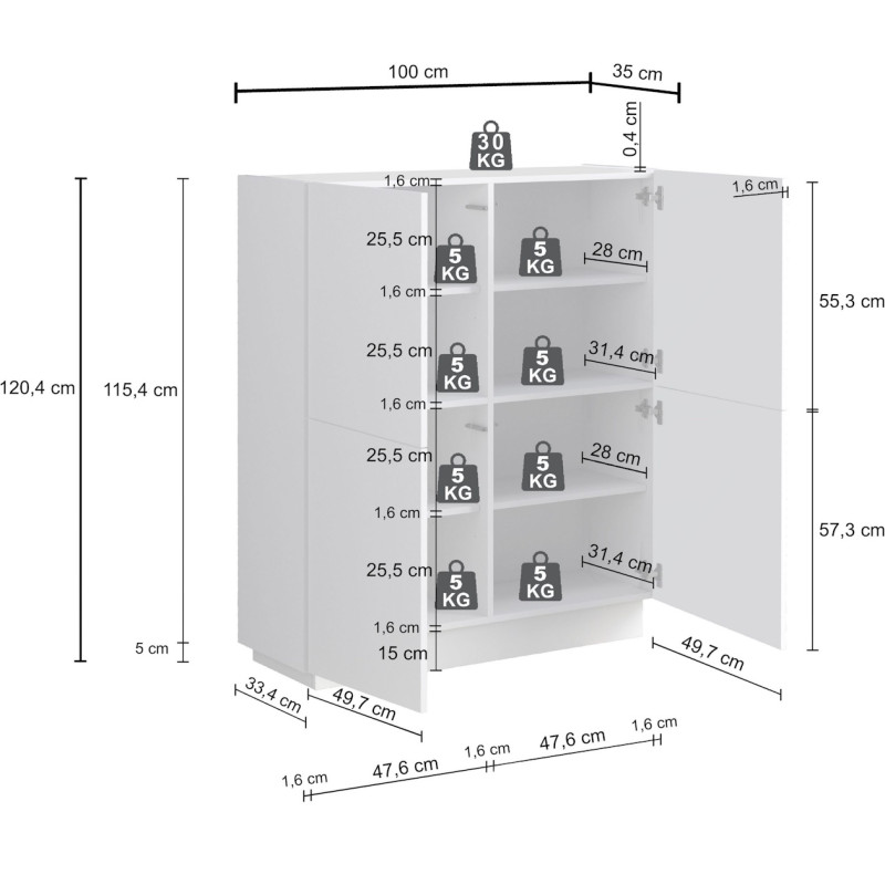 Côté dimensions, ce meuble de salle à manger affiche un format bien pensé de 100 cm de longueur, 120 cm de hauteur et 35 cm de profondeur, ce qui lui permet de s'implanter facilement le long d'un mur sans empiéter sur l'espace de circulation. Fabriqué en Italie avec soin, il repose sur une structure en panneaux de particules mélaminés de première qualité de 16 mm, alliant robustesse et légèreté visuelle. Le corps blanc mat contraste subtilement avec les façades blanc brillant, créant un jeu de matières sophistiqué qui renforce l'élégance générale du meuble.