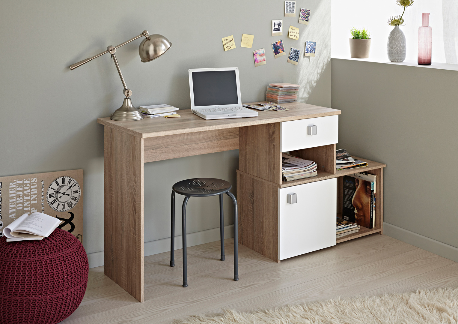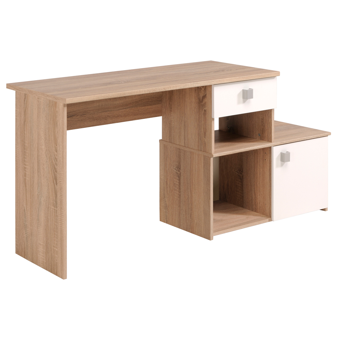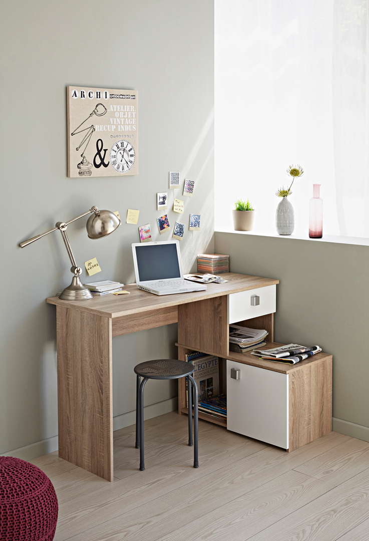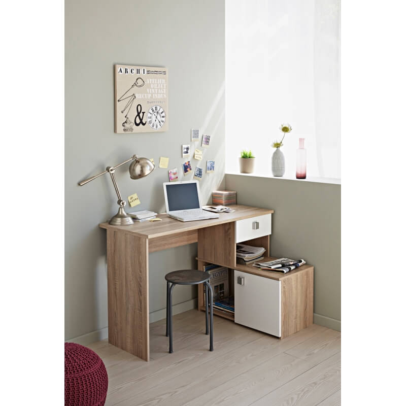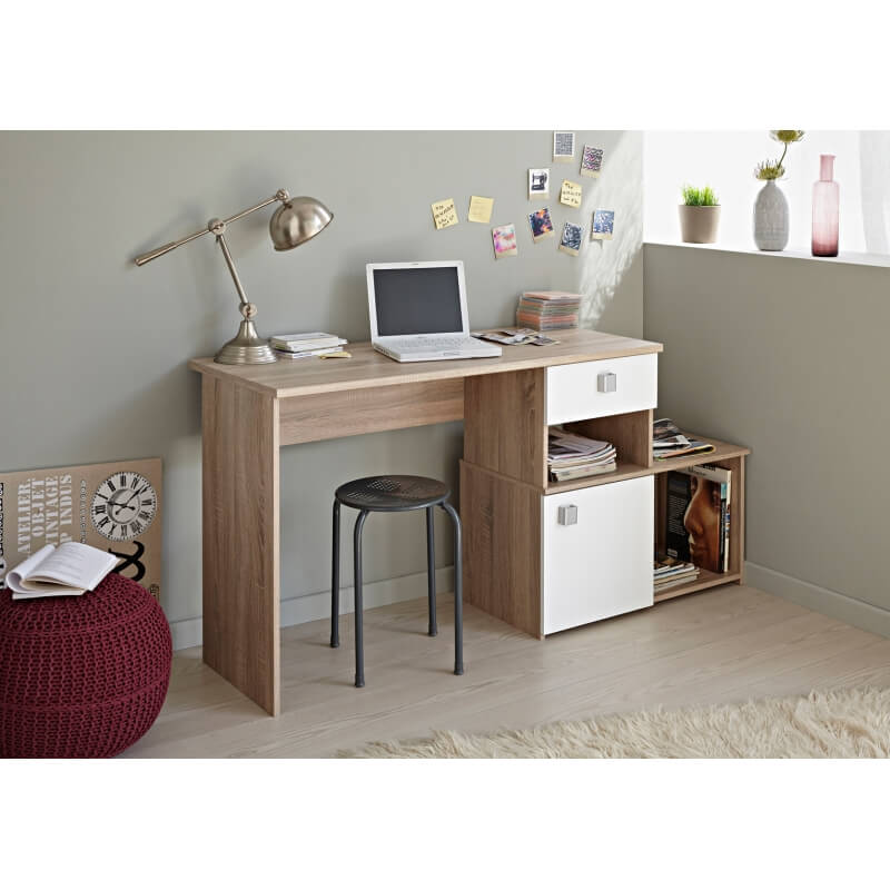 Le bureau contemporain Madisone II vous offrira un bel espace de travail et de rangement. Sa structure est fabriquée en panneaux de particules de première qualité. Il se compose d'un large plan de travail et d'un espace de rangement comprenant 2 niches, d'un tiroir monté sur coulisses métalliques et d'une porte. Le bureau Madisone II pourra être monté de 2 façons différentes selon l'agencement de votre pièce.