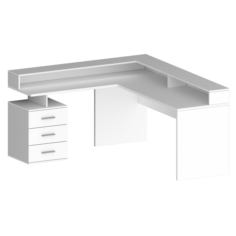 Le design astucieux de ce bureau avec réhausse inclut trois tiroirs spacieux équipés de glissières métalliques, parfaits pour organiser vos documents et accessoires. Son plateau d’angle ergonomique optimise l’utilisation de votre espace, tout en vous offrant une surface de travail confortable. Que ce soit pour un usage professionnel ou personnel, ce modèle allie praticité et esthétique, s'adaptant aisément à vos besoins quotidiens.