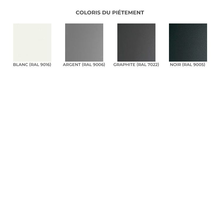 | Structure | Traverse 50x50x1,5 cm et deux montants de 50x30x2 mm unis par soudure MIG finition époxy argent, blanc ou graphite |