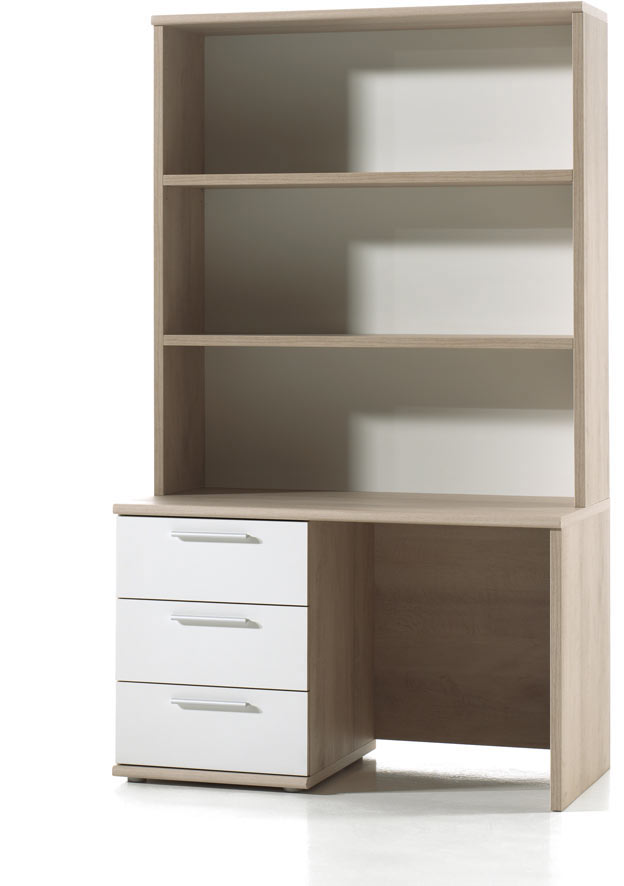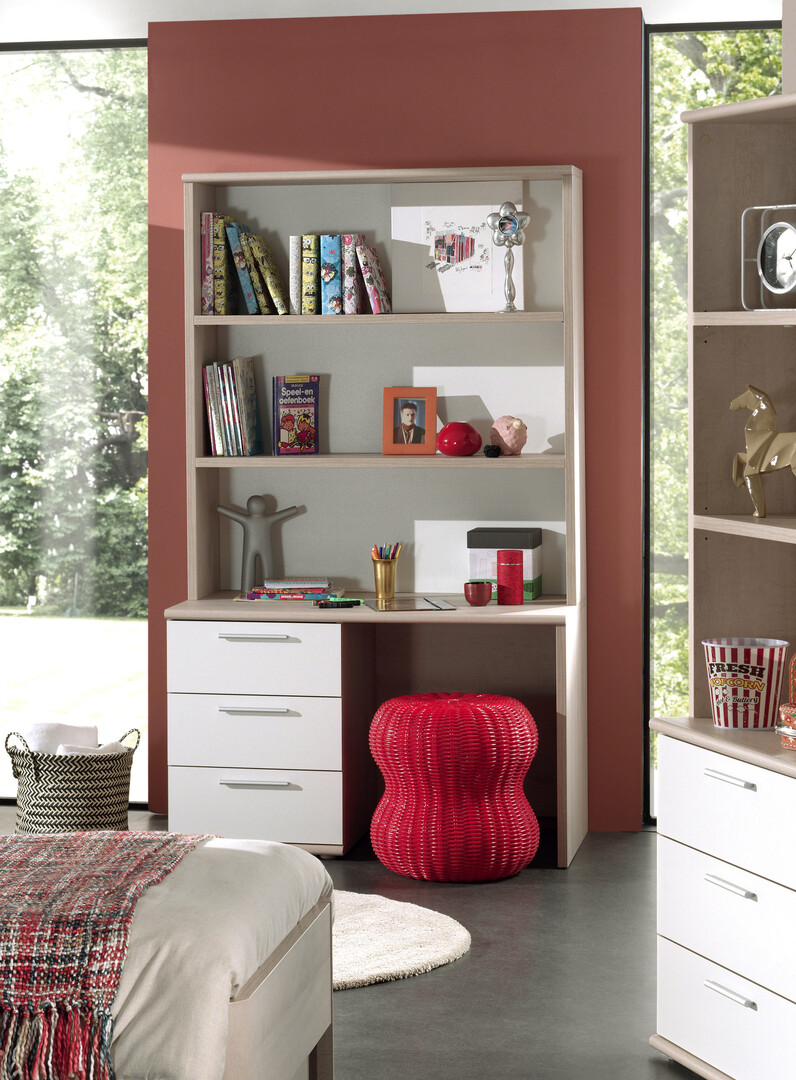 Le bureau droit est équipé d’un caisson fixe de 3 tiroirs placé sous le plan de travail. Une réhausse séparable de 3 étagères profondes, mais bien aérées en hauteur, complète l’espace de rangement. Entouré de ses livres de cours, classeurs, voire de quelques bibelots, votre enfant étudie à son aise et en toute autonomie. Doté de rangement ouverts et fermés, l’espace de travail est agréable, à la fois compact et fonctionnel.