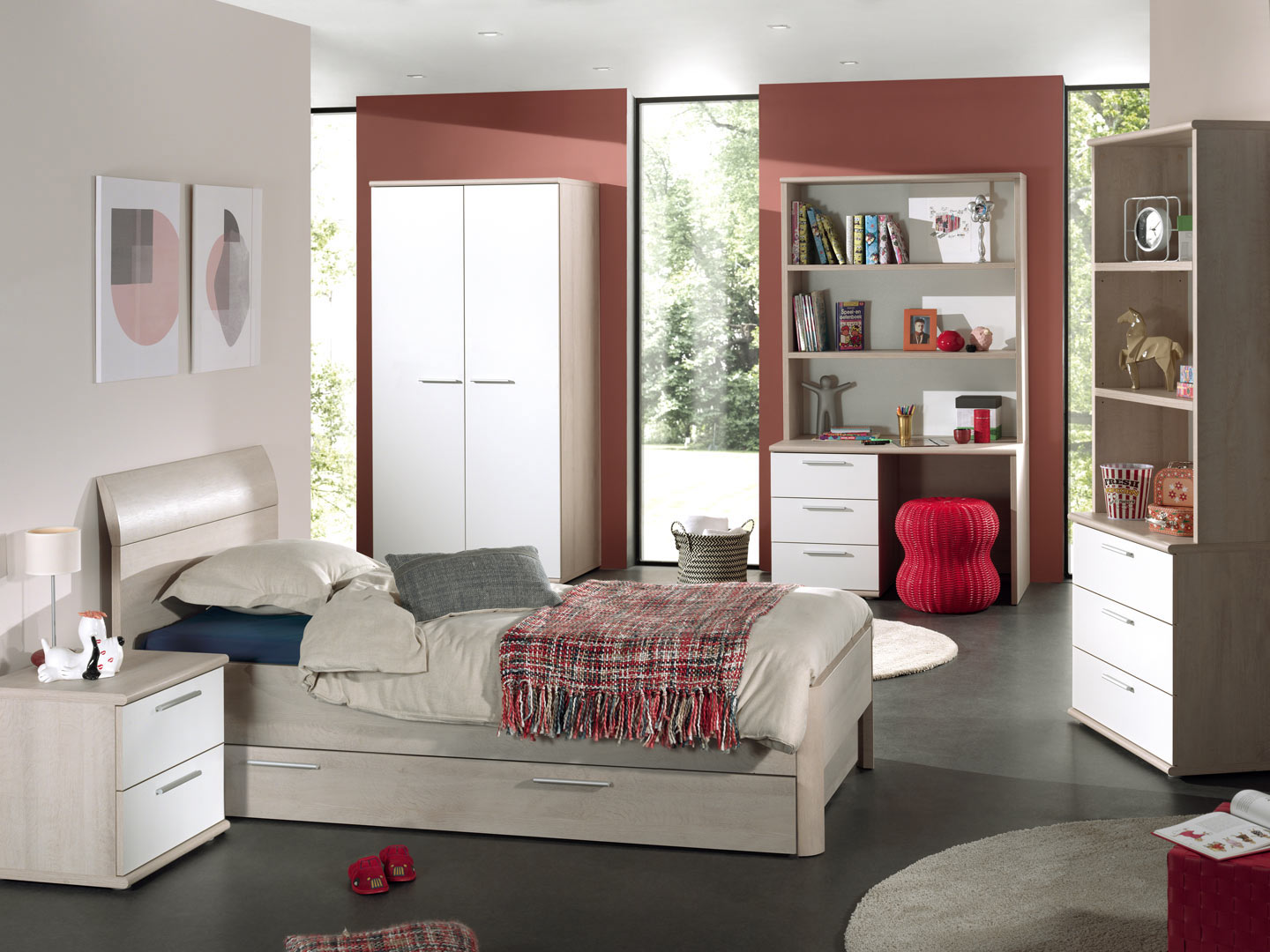 Pour une chambre d’enfant harmonieuse, au style naturel épuré, complétez ce bureau étagère avec les éléments de la chambre Square, comportant le lit junior bicolore avec tête de lit décorative en chêne et grand tiroir de rangement, la table de nuit 2 tiroirs en mélamine, la commode avec réhausse et l’armoire 2 portes. Un style déco ultra tendance, à compléter d’une chaise de bureau ergonomique, d’un tapis façon peau de mouton et d’une lampe de table en bois.