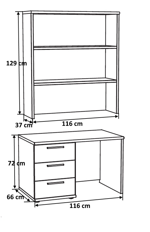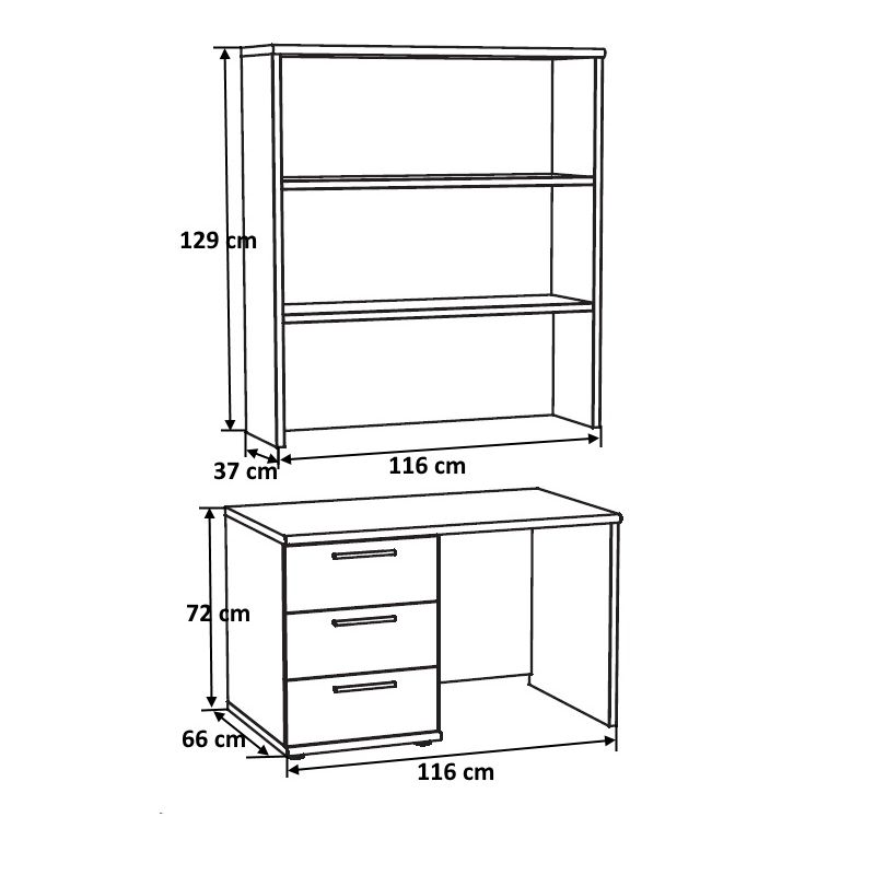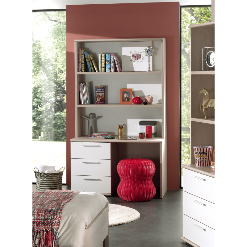 D’une largeur d’1,16 mètre, ce bureau-bibliothèque s’installe contre un mur et se développe sur 2 mètres de haut. Fabriqué en panneaux de particules finition chêne clair, ses tiroirs se distinguent par une façade blanche mélaminée, assortie au fond d’étagère. De larges poignées bâton de maréchal affirment le style de ce bureau enfant contemporain.