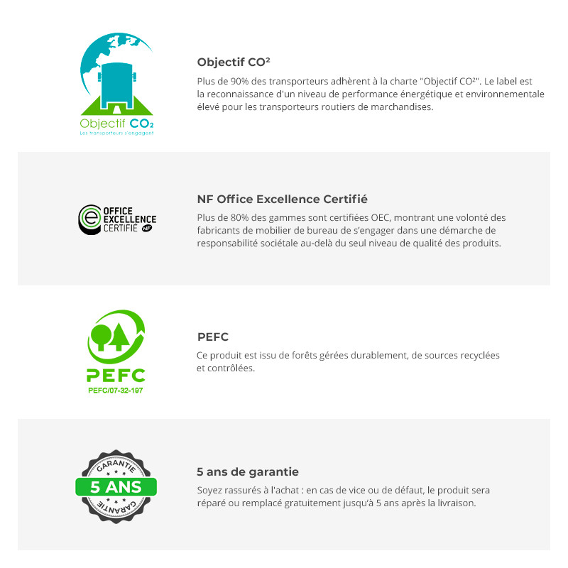 Plus de 80% des gammes sont certifiées OEC, montrant une volonté des fabricants de mobilier de bureau de s’engager dans une démarche de responsabilité sociétale au-delà du seul niveau de qualité des produits.