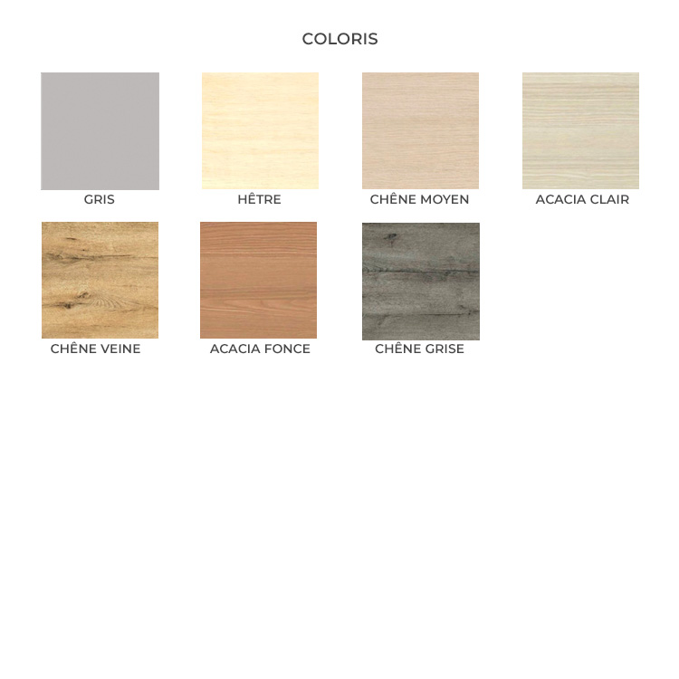 | Coloris | Gris, hêtre, chêne moyen, acacia clair, acacia foncé, chêne veiné ou chêne grisé |
