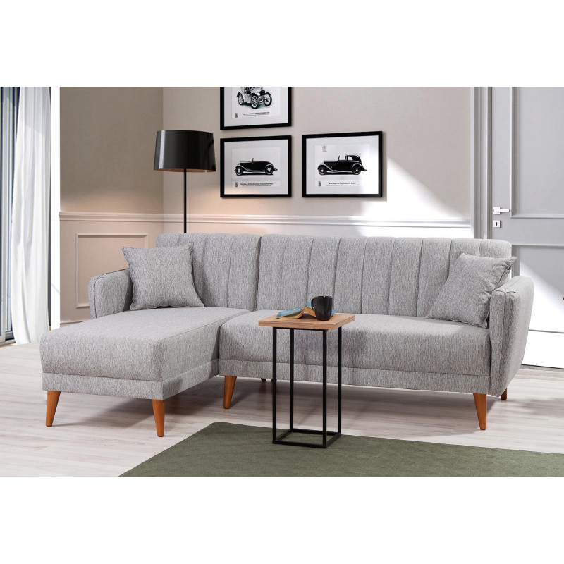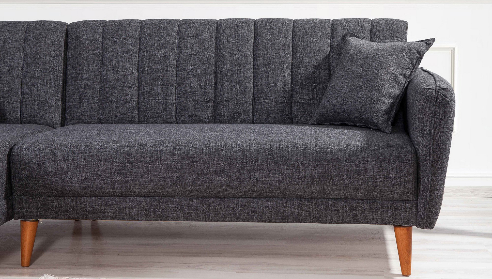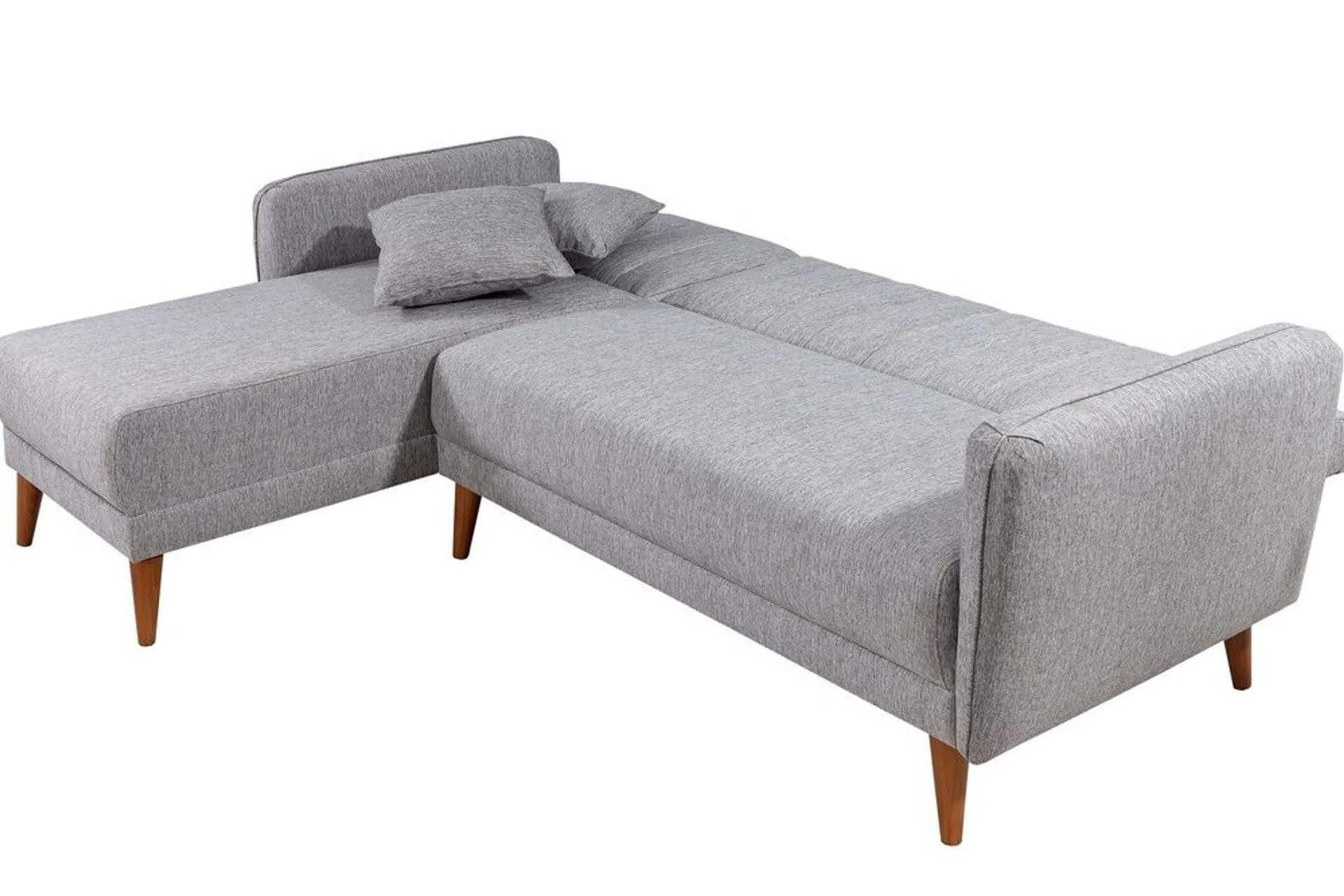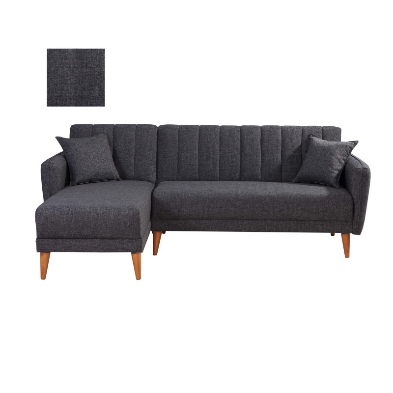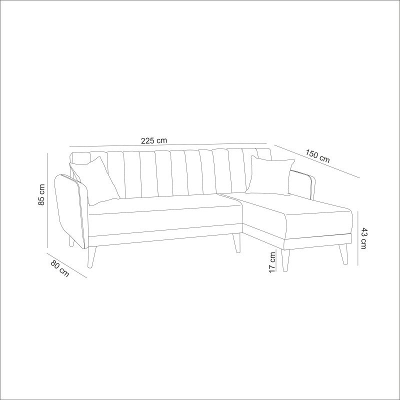 Les dimensions généreuses de ce canapé d'angle convertible permettent d'accueillir confortablement 3 personnes et plus avec ses 225 cm de longueur. L'assise profonde de 56 cm et sa hauteur de 43 cm offrent une position assise ergonomique pour des moments de détente prolongés. Le dossier culmine à 85 cm pour un maintien dorsal parfait, tandis que la profondeur variable (80 à 150 cm selon la configuration) s'adapte à vos besoins d'aménagement. Les pieds en bois de 17 cm apportent une élévation subtile qui facilite l'entretien tout en renforçant le caractère moderne de l'ensemble.