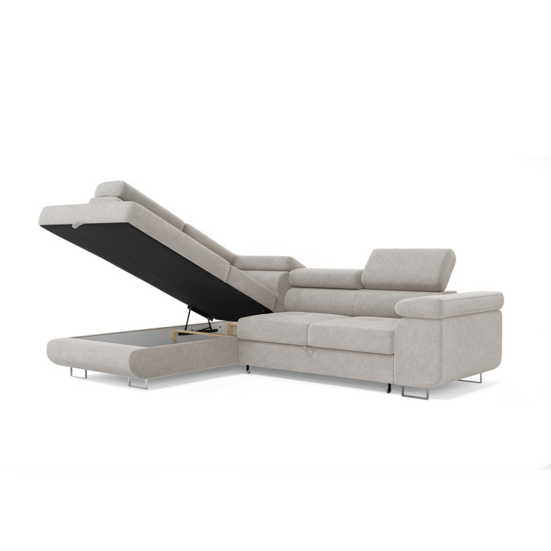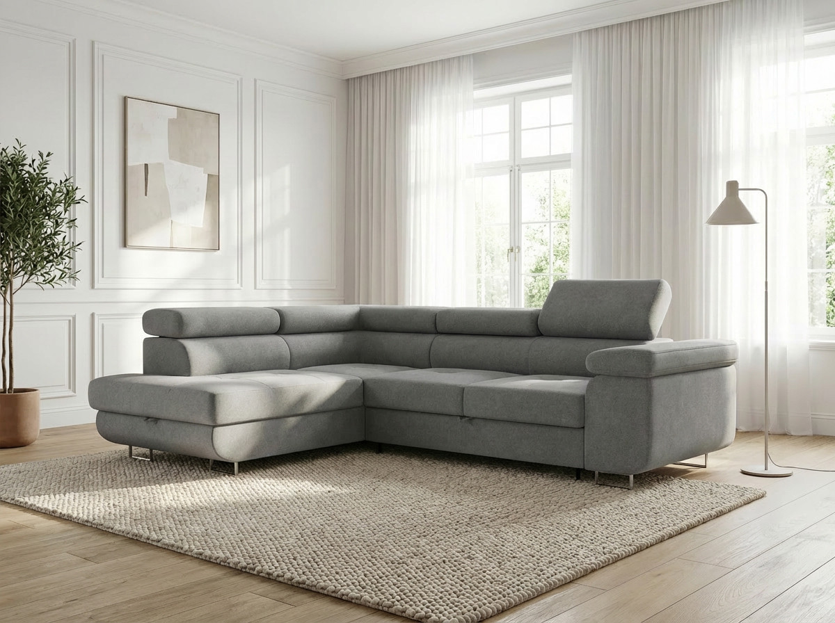 Ce canapé d'angle convertible se révèle particulièrement astucieux avec son coffre de rangement intégré, solution pratique pour optimiser l'espace de votre intérieur. Les accoudoirs généreux (30x97 cm) offrent un appui confortable, tandis que l'assise profonde de 56 cm et sa hauteur de 42 cm assurent une position ergonomique idéale. Le dossier garni de mousse polyuréthane avec une densité de 23 kg/m³ complète harmonieusement le confort d'assise, procurant un maintien agréable pour de longues heures de détente.