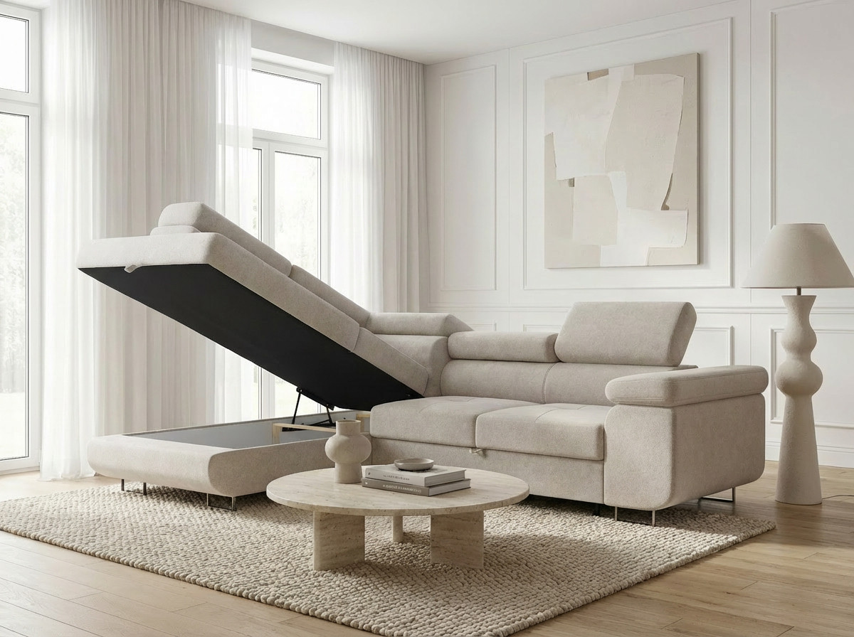 Un coffre de rangement intégré optimise l'espace, garde votre salon ordonné et facilite l'organisation.