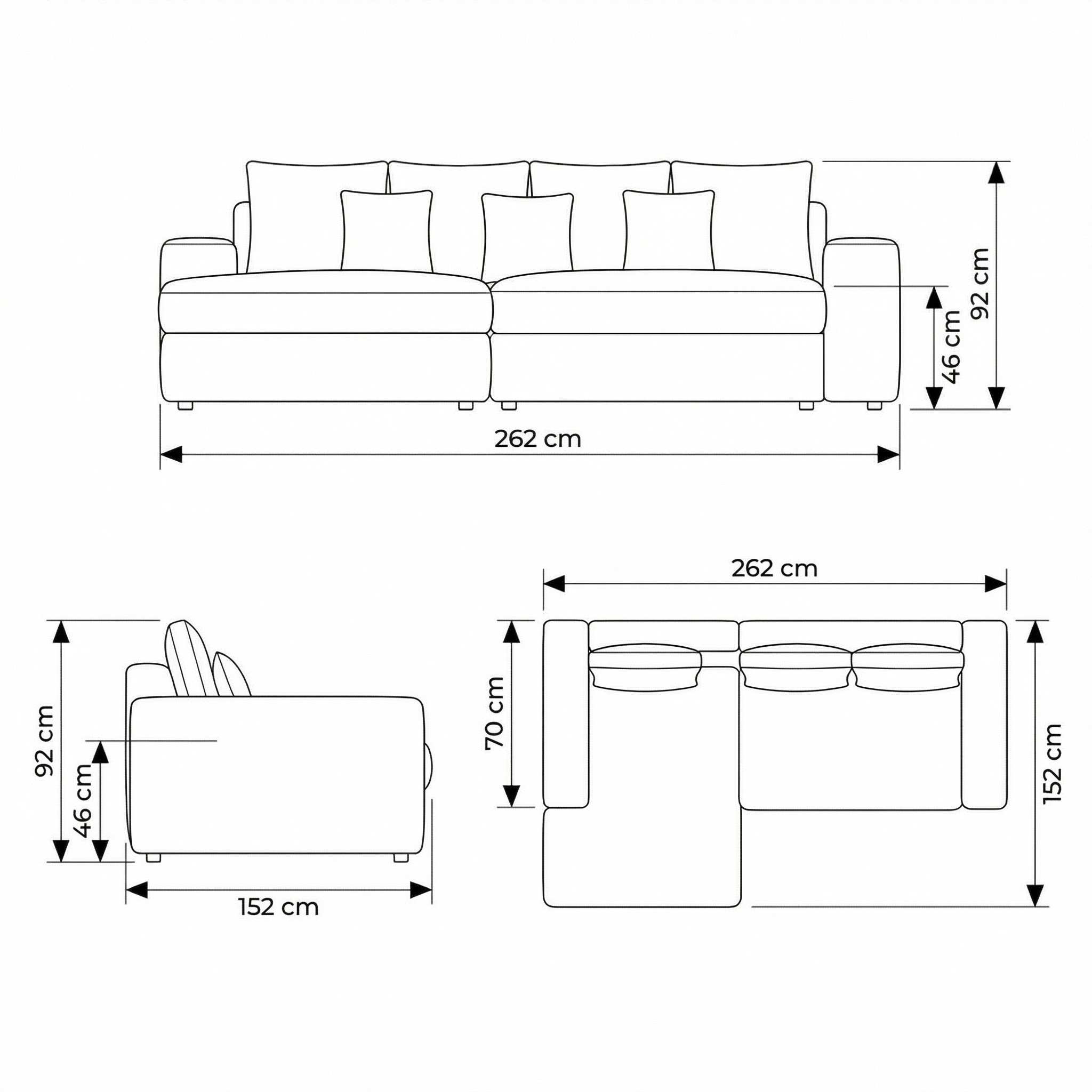 L'assise de ce canapé d'angle a été conçue pour procurer un confort exceptionnel avec ses 46 cm de hauteur et ses dimensions généreuses de 70 à 112 cm de profondeur, permettant de s'installer confortablement dans différentes positions. Le garnissage associe intelligemment de la mousse polyuréthane d'une densité de 30 kg/m3 et des ressorts zigzag, créant ainsi un soutien ferme et résistant qui préserve sa forme même après des années d'utilisation quotidienne. Le piétement en bois massif assure une stabilité impeccable tandis que les coussins du dossier, dotés de housses amovibles et remplis de flocons de mousse, invitent à la détente absolue.