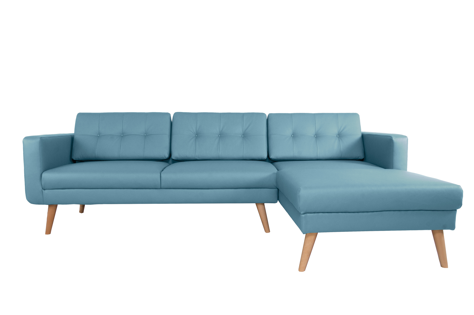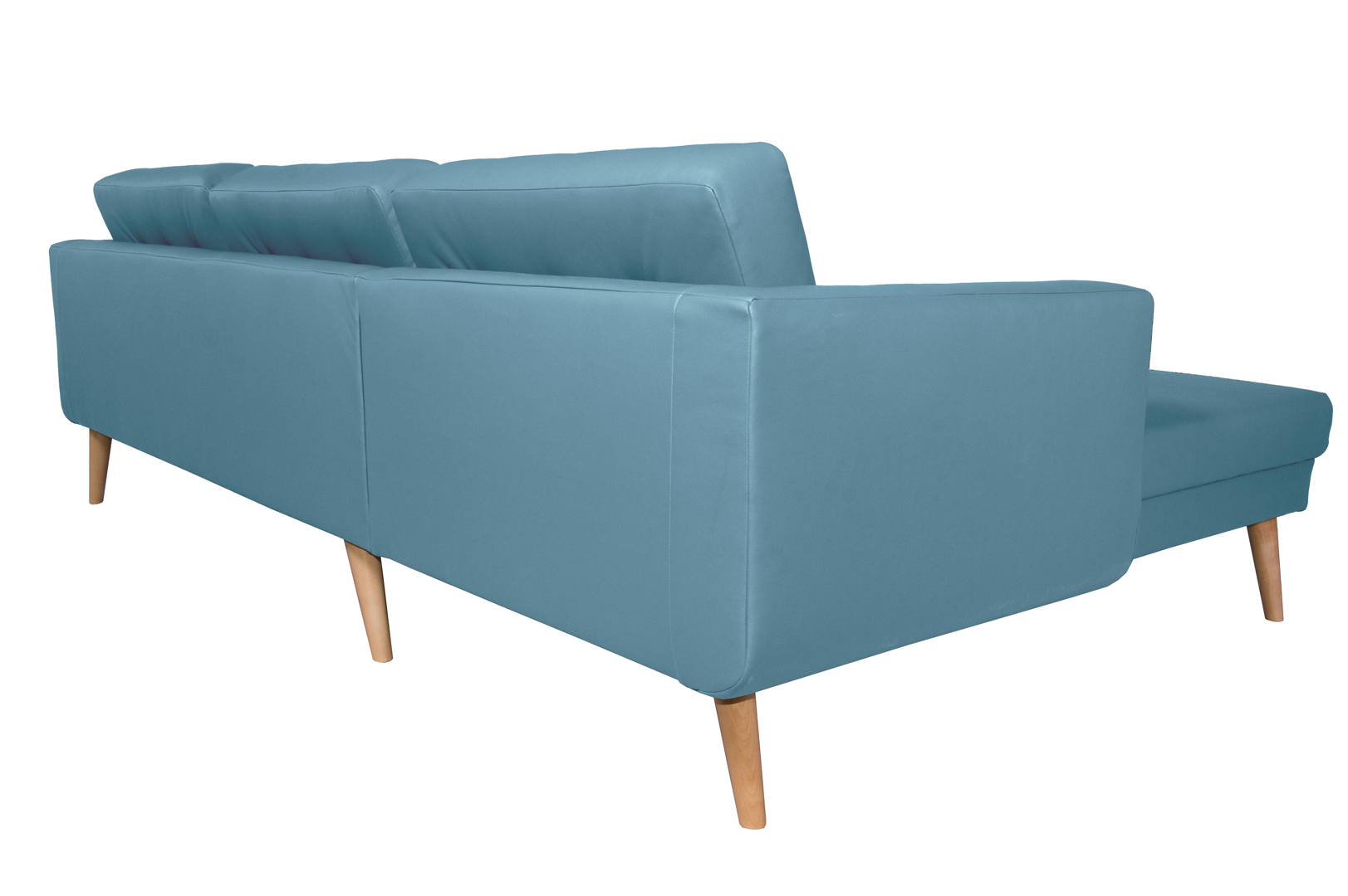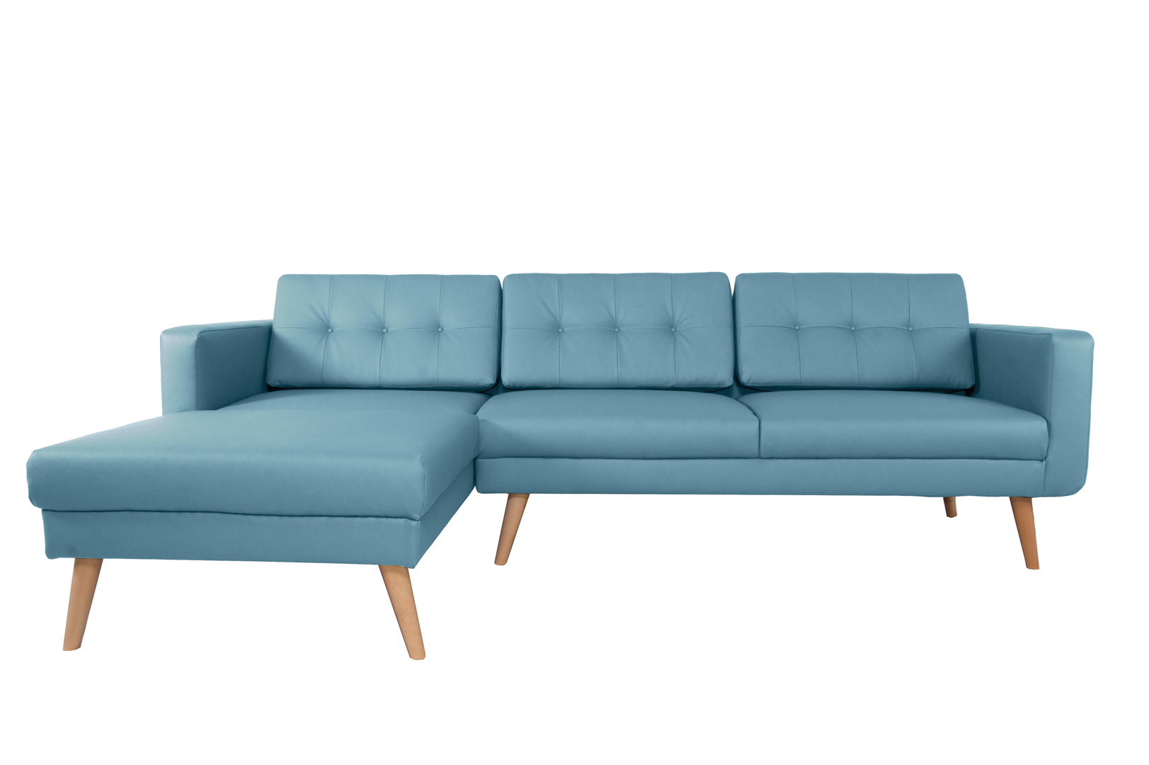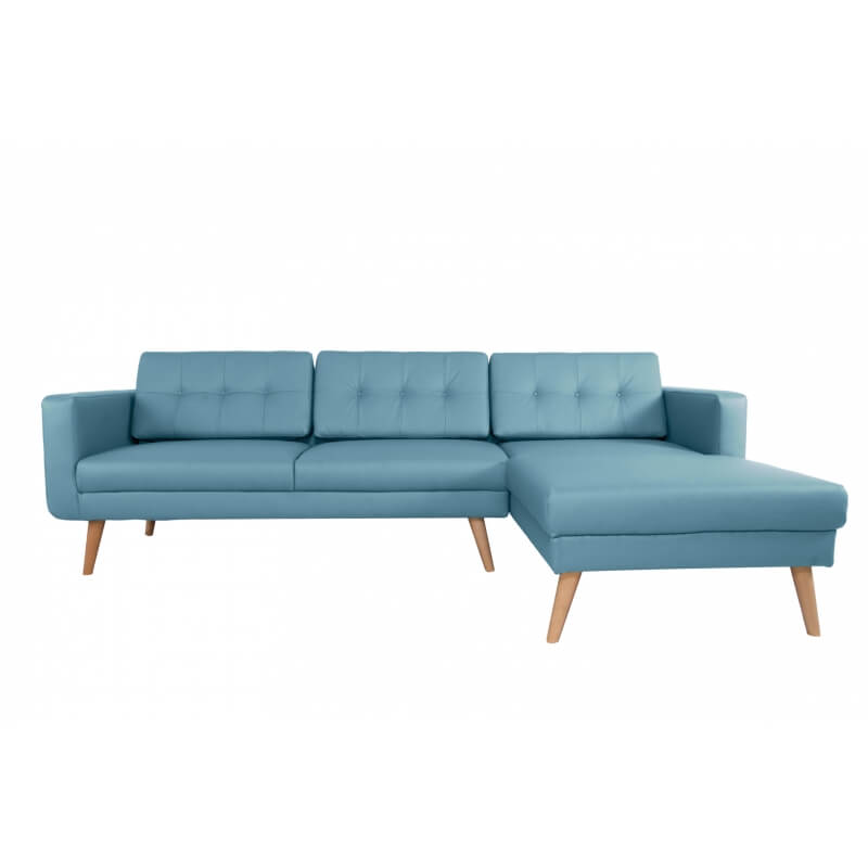 Sobre et élégant à la fois, le canapé d'angle Koreva apportera une touche résolument moderne dans votre intérieur. Sa structure est fabriquée en bois massif (pin et hêtre) et panneaux de particules de première qualité garnie de 6 cm de mousse polyuréthane de 20 kg/m3 de densité et recouverte de PU soft coloris bleu. Les accoudoirs ont une hauteur de 66 cm et mesurent 13 cm de large. L'assise équipée de sangles élastiques est garnie de 12 cm de mousse polyuréthane de 35 kg/m3 de densité. Les coussins sont garnis de 12 cm de mousse polyuréthane de 20 kg/m3 de densité et de ouate (200g/m²). Le canapé Koreva est doté de 7 pieds en hêtre naturel de 22 cm de hauteur. Il vous sera possible de choisir la position de l'angle.