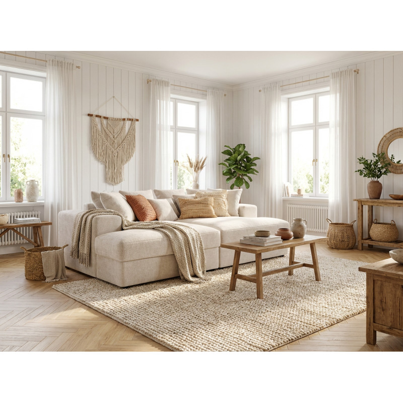 Conçu pour offrir un confort exceptionnel, le Lumy dispose d'une assise profonde de 160 cm avec coussins, soutenue par une combinaison de mousse polyuréthane haute densité (30 kg/m³) et de ressorts double Bonnel. Cette banquette en tissu de style moderne accueille confortablement trois personnes grâce à sa largeur d'assise de 224 cm et sa hauteur ergonomique de 50 cm. Le dossier est agrémenté de coussins décoratifs de dimensions 40x40 cm et 50x50 cm, apportant une touche de moelleux supplémentaire. La structure robuste en MDF et panneaux de particules HDF, associée à un piétement en PVC de 5 cm, assure une stabilité irréprochable avec une capacité de charge maximale de 250 kg.