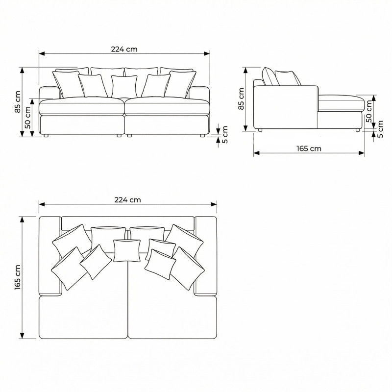 Fabriqué en Europe selon des standards de qualité rigoureux, ce modèle allie esthétique et robustesse grâce à sa structure en MDF et panneaux de particules HDF. Le garnissage de l'assise combine intelligemment mousse polyuréthane haute densité de 30 kg/m³ et ressorts double Bonnel, garantissant un confort optimal et une excellente durabilité dans le temps. Les coussins de dossier aux dimensions généreuses (40x40 cm et 50x50 cm) complètent l'ensemble pour créer une assise moelleuse et accueillante, tandis que ce canapé fixe design repose sur des pieds en PVC de 5 cm de hauteur qui assurent une stabilité parfaite.