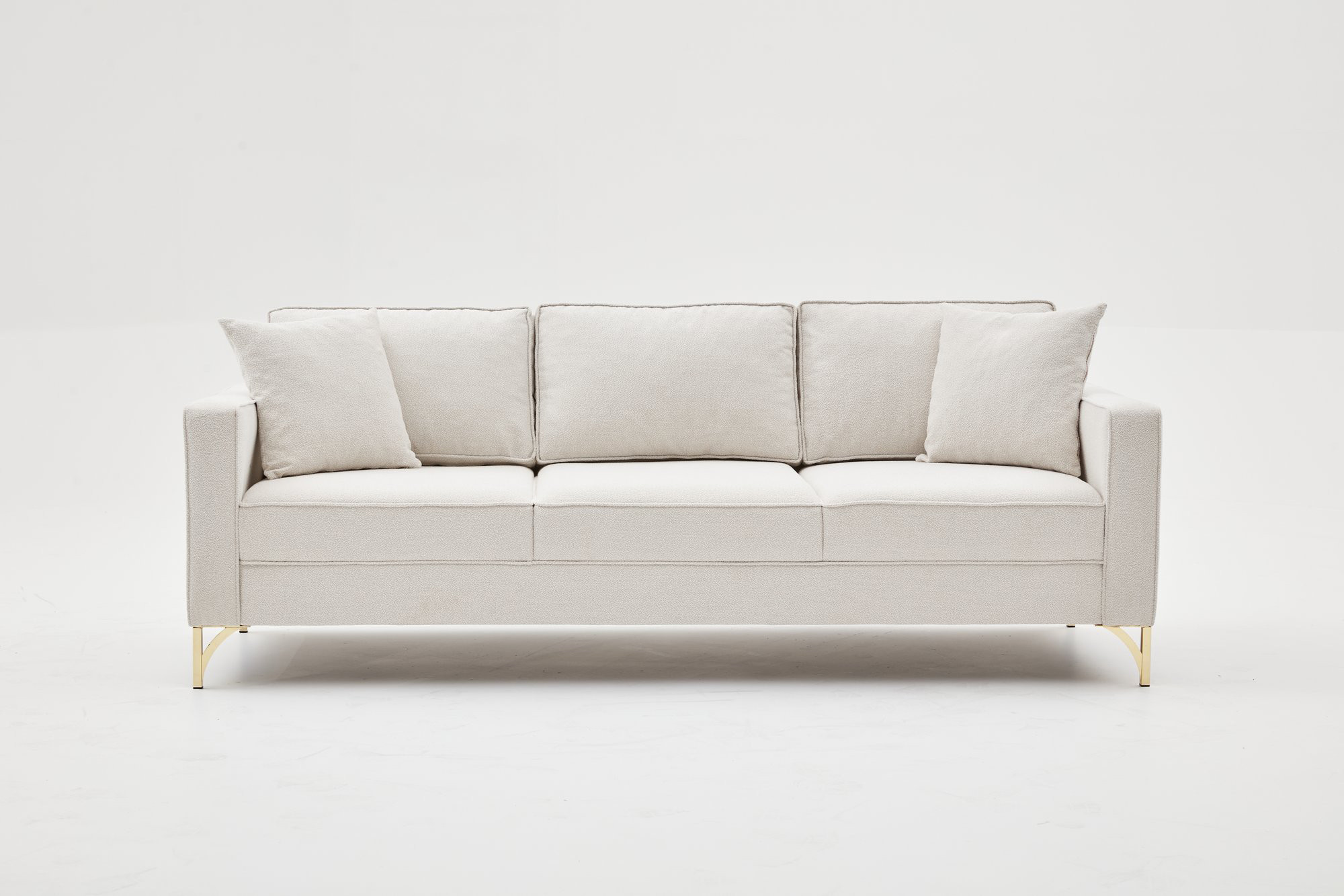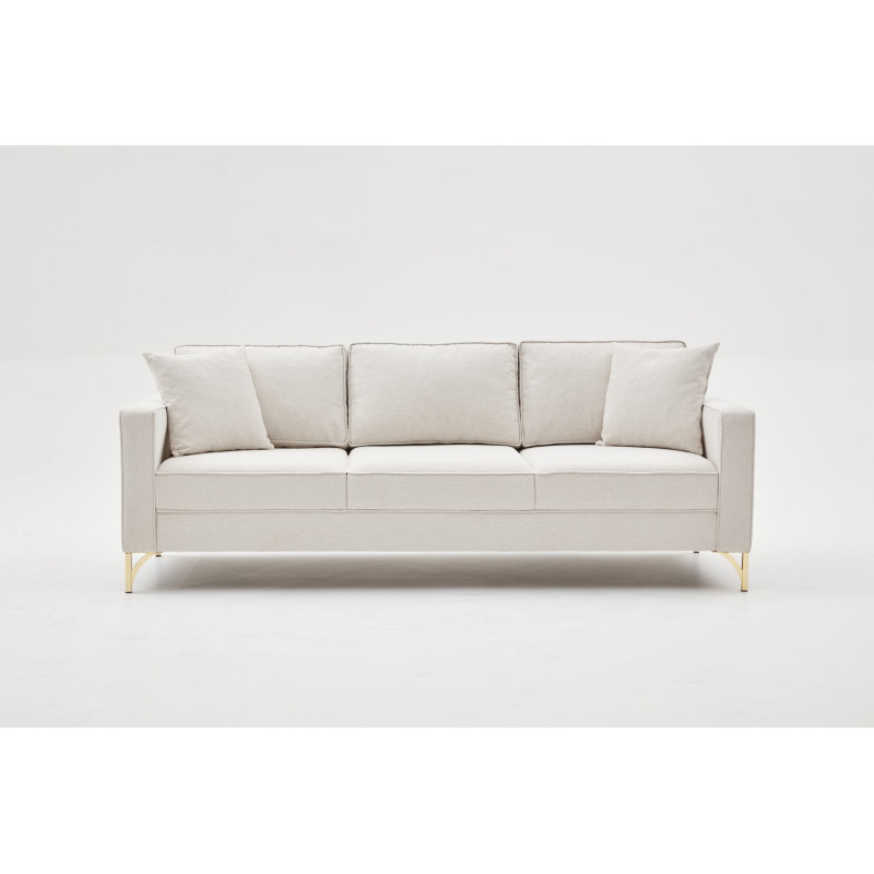 L'esthétique soignée de ce canapé droit se révèle dans chaque détail de sa finition. Le piètement en métal gold d'une hauteur de 13 cm apporte une note de raffinement et de modernité tout en assurant une stabilité parfaite. Cette touche dorée crée un contraste élégant avec la douceur du tissu crème, rehaussant le caractère haut de gamme du mobilier. Le style moderne de Paula s'adapte aussi bien aux intérieurs contemporains qu'aux ambiances plus éclectiques, offrant une polyvalence décorative remarquable.
