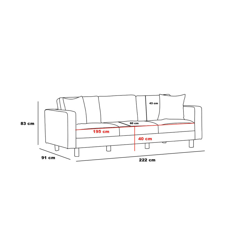La conception de ce canapé privilégie avant tout le confort optimal de ses utilisateurs. L'assise, d'une largeur de 195 cm et d'une profondeur de 60 cm, repose à 43 cm du sol pour permettre une position assise idéale. Le garnissage en mousse polyuréthane haute densité de 28 kg/m³ assure un soutien ferme et durable, tandis que le dossier garni de flocons de mousse offre un accueil moelleux et enveloppant. La structure en hêtre massif garantit la robustesse et la longévité de ce meuble, conçu pour résister aux sollicitations quotidiennes d'un usage particulier intensif.