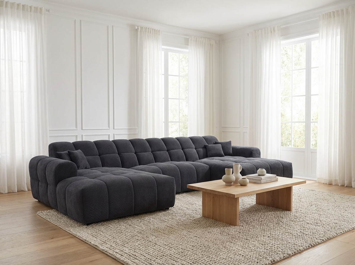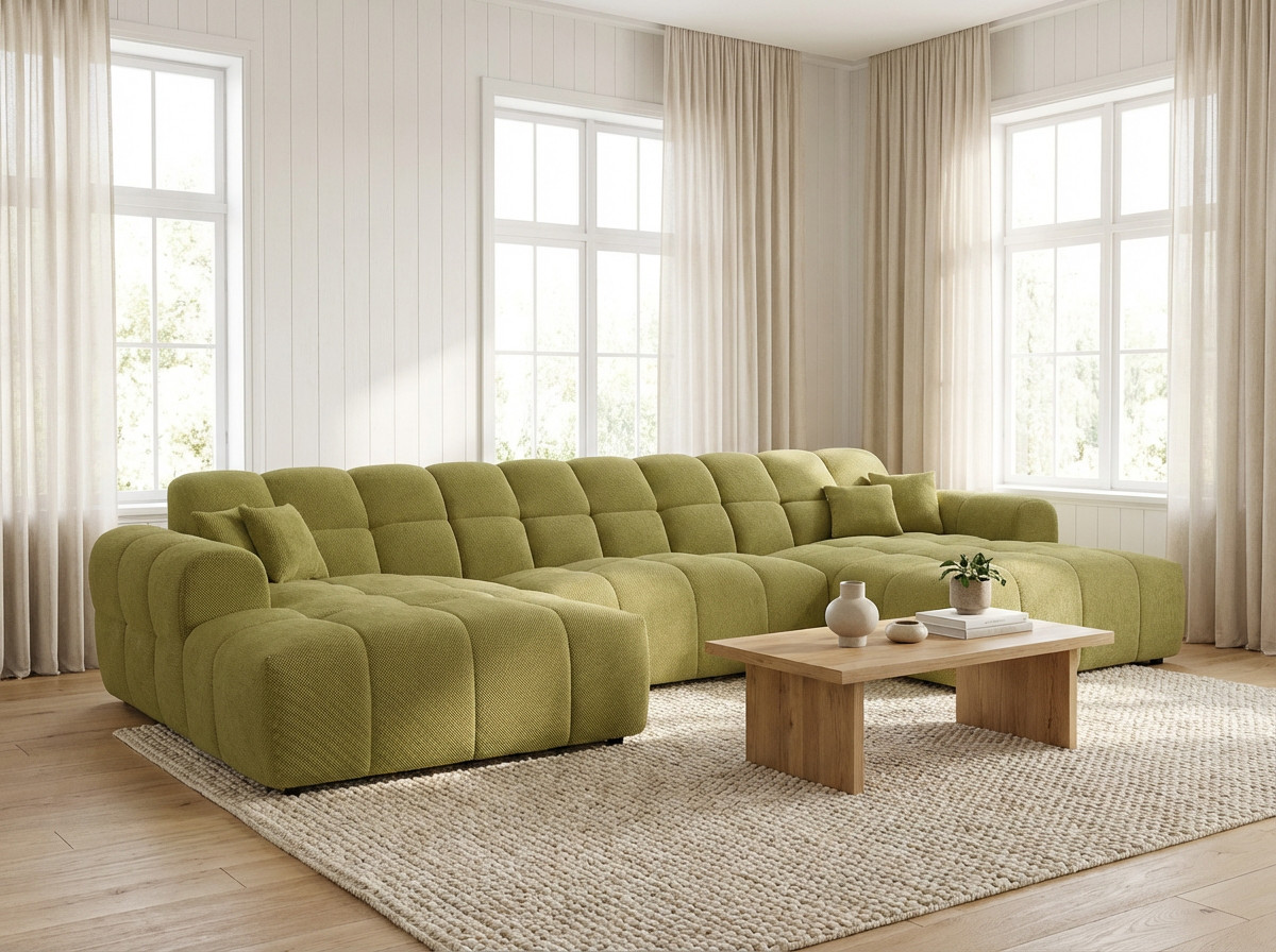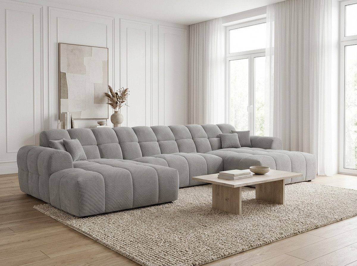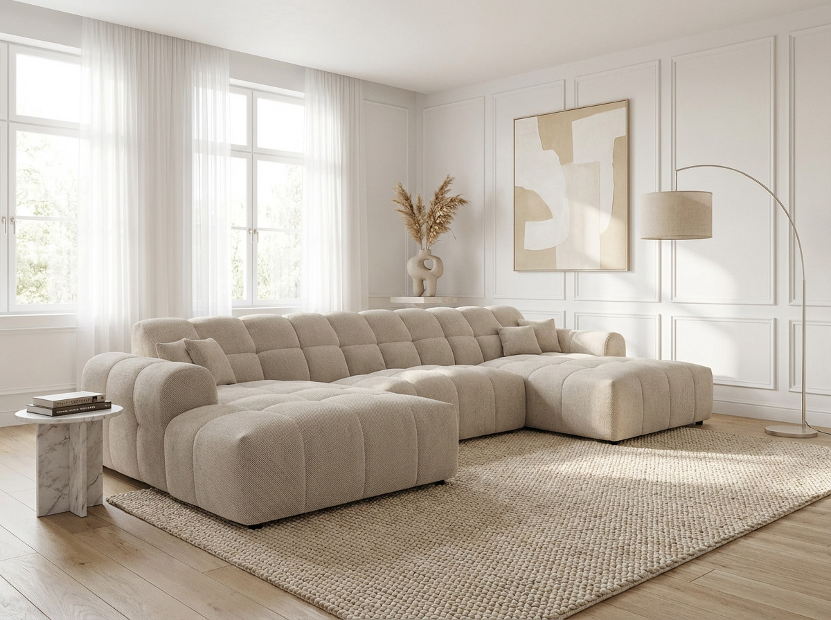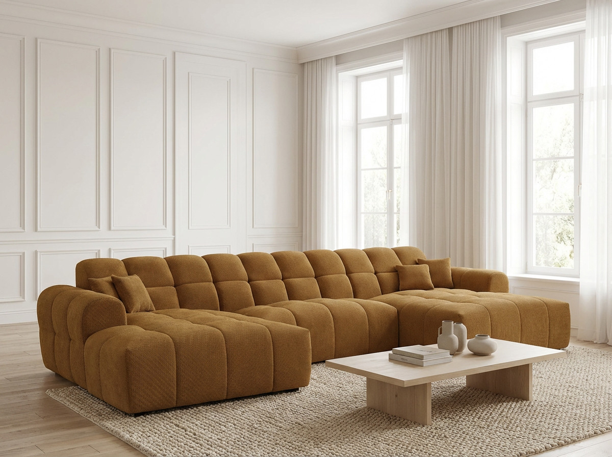 Le canapé panoramique moderne en tissu Roxie de la marque Vivabita incarne l'alliance parfaite entre design contemporain et confort optimal. Avec ses dimensions généreuses de 320 cm de longueur et 162 cm de profondeur, ce canapé panoramique transforme votre espace de vie en un véritable havre de détente. Fabriqué en Europe, il témoigne d'un savoir-faire reconnu et d'une qualité de fabrication irréprochable. Son style résolument moderne s'adapte à tous les intérieurs contemporains, tandis que sa palette de coloris variée - beige, gris, olive, moutarde, bleu foncé ou anthracite - permet de personnaliser votre salon selon vos envies décoratives.
