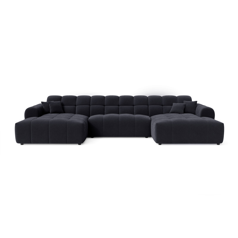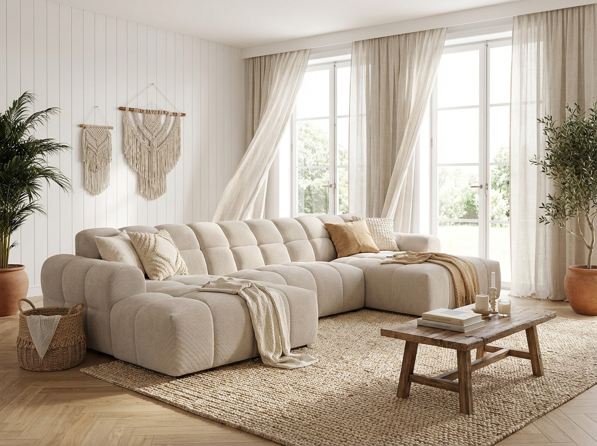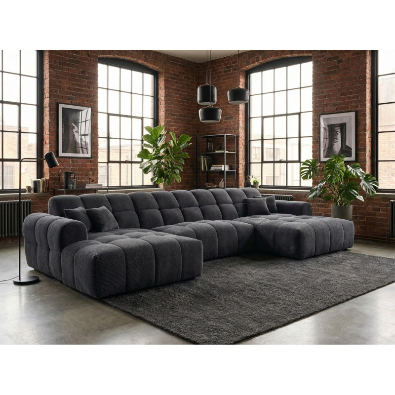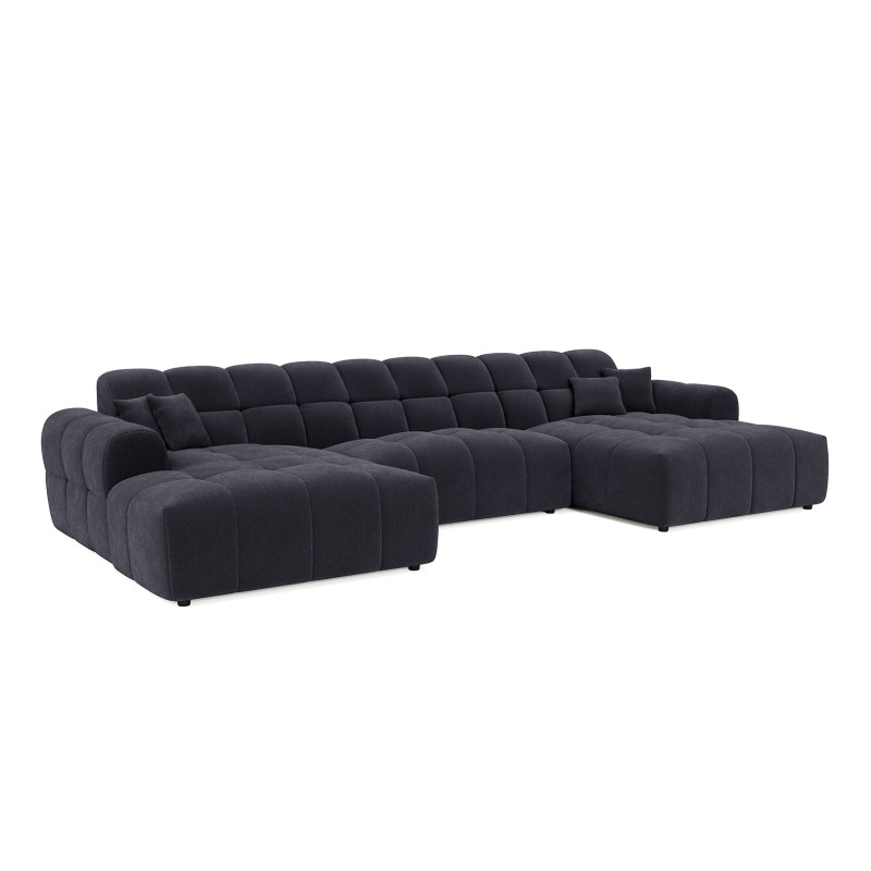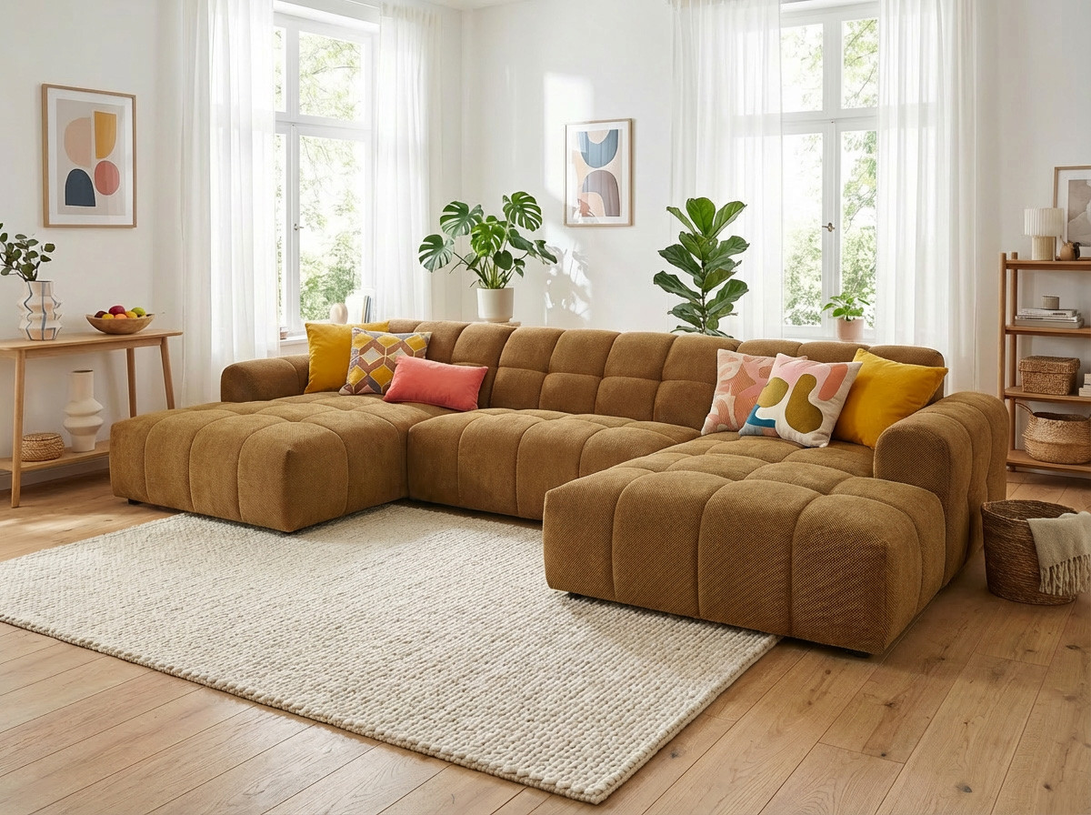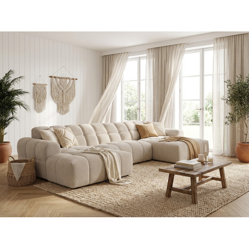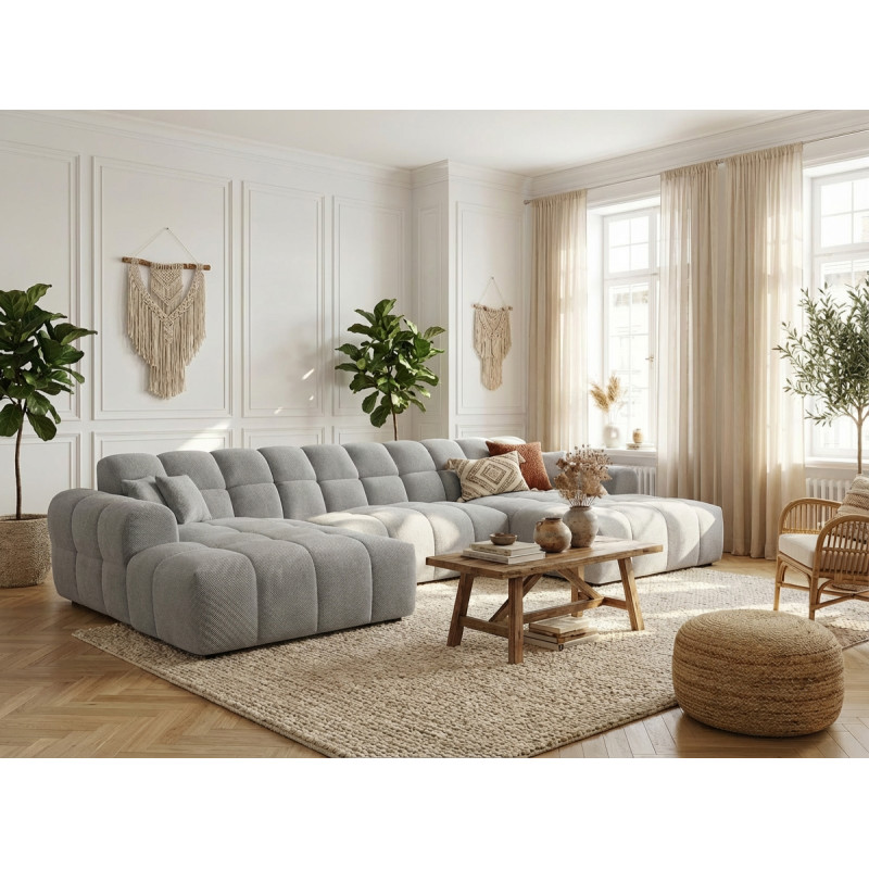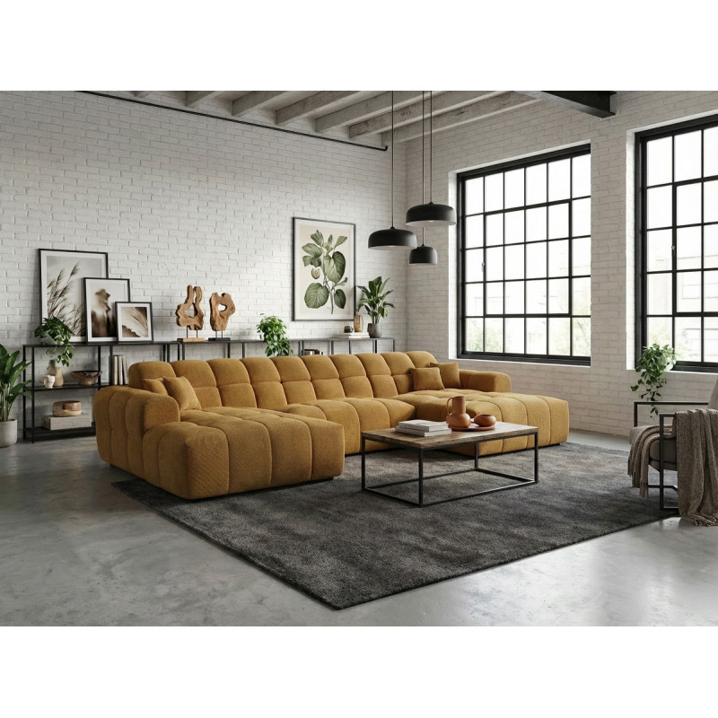 La structure du Roxie repose sur une conception robuste en MDF et panneaux de particules HDF, garantissant une solidité à toute épreuve avec un poids maximal conseillé de 275 kg. Le garnissage de l'assise combine intelligemment mousse polyuréthane haute densité (28 kg/m³) et ressorts ondulés, offrant un soutien ferme et durable. Le dossier bénéficie également d'une mousse polyuréthane HD de 23 kg/m³ pour un maintien optimal du dos. Avec une hauteur d'assise de 40 cm et une profondeur variable de 58 à 120 cm, ce canapé en U accueille confortablement 3 personnes et plus, idéal pour les moments conviviaux en famille ou entre amis.