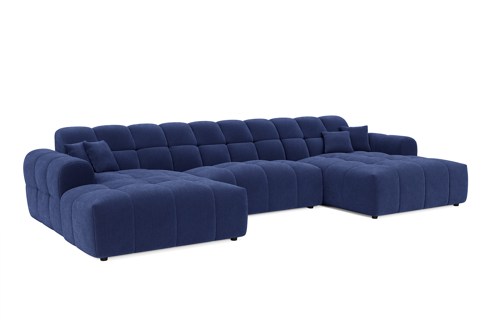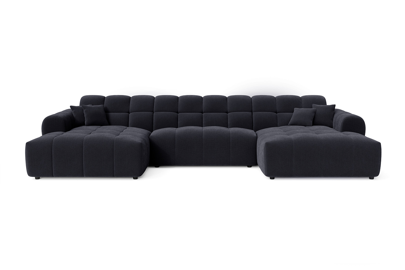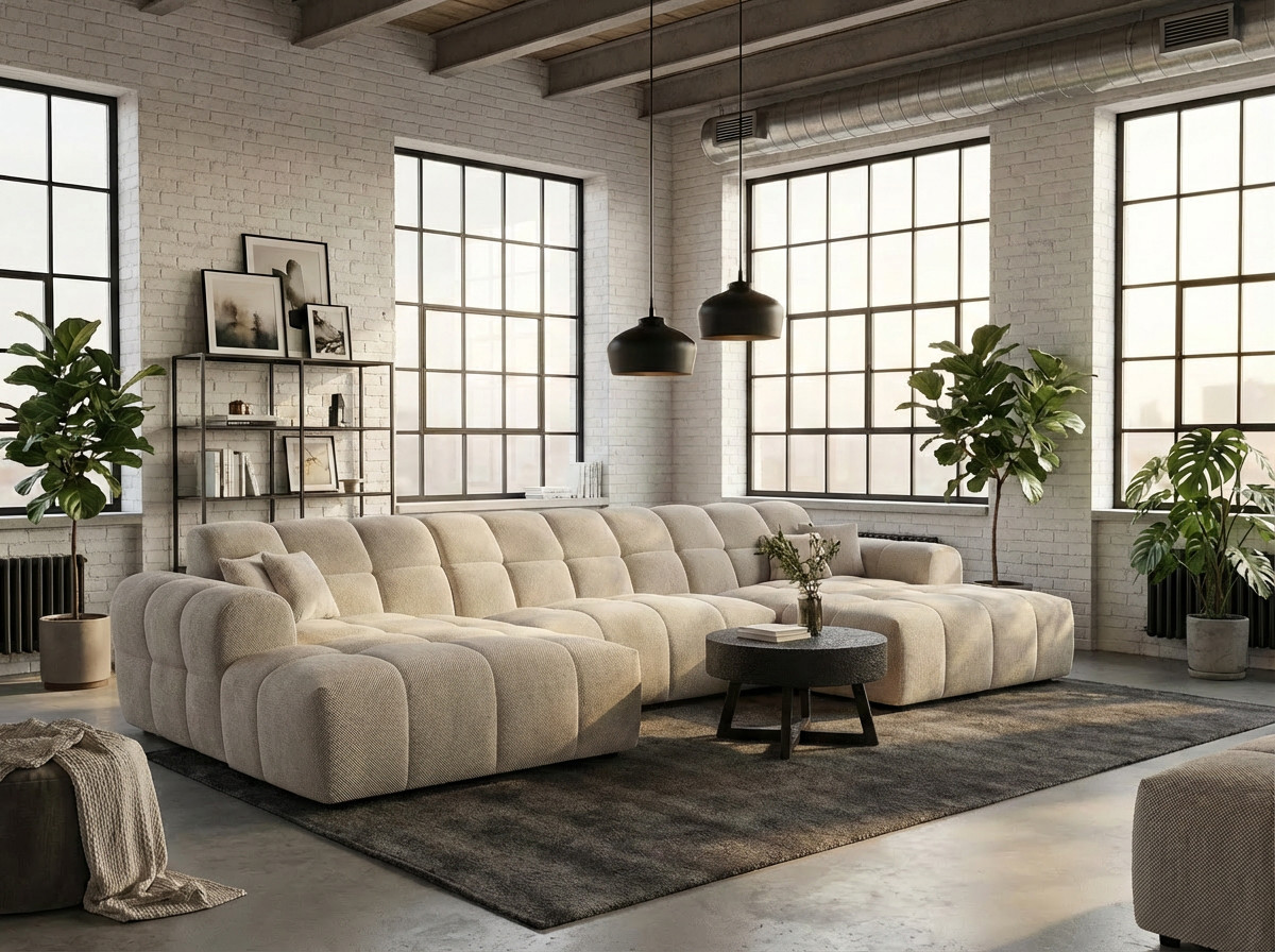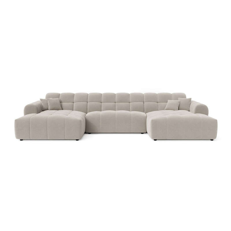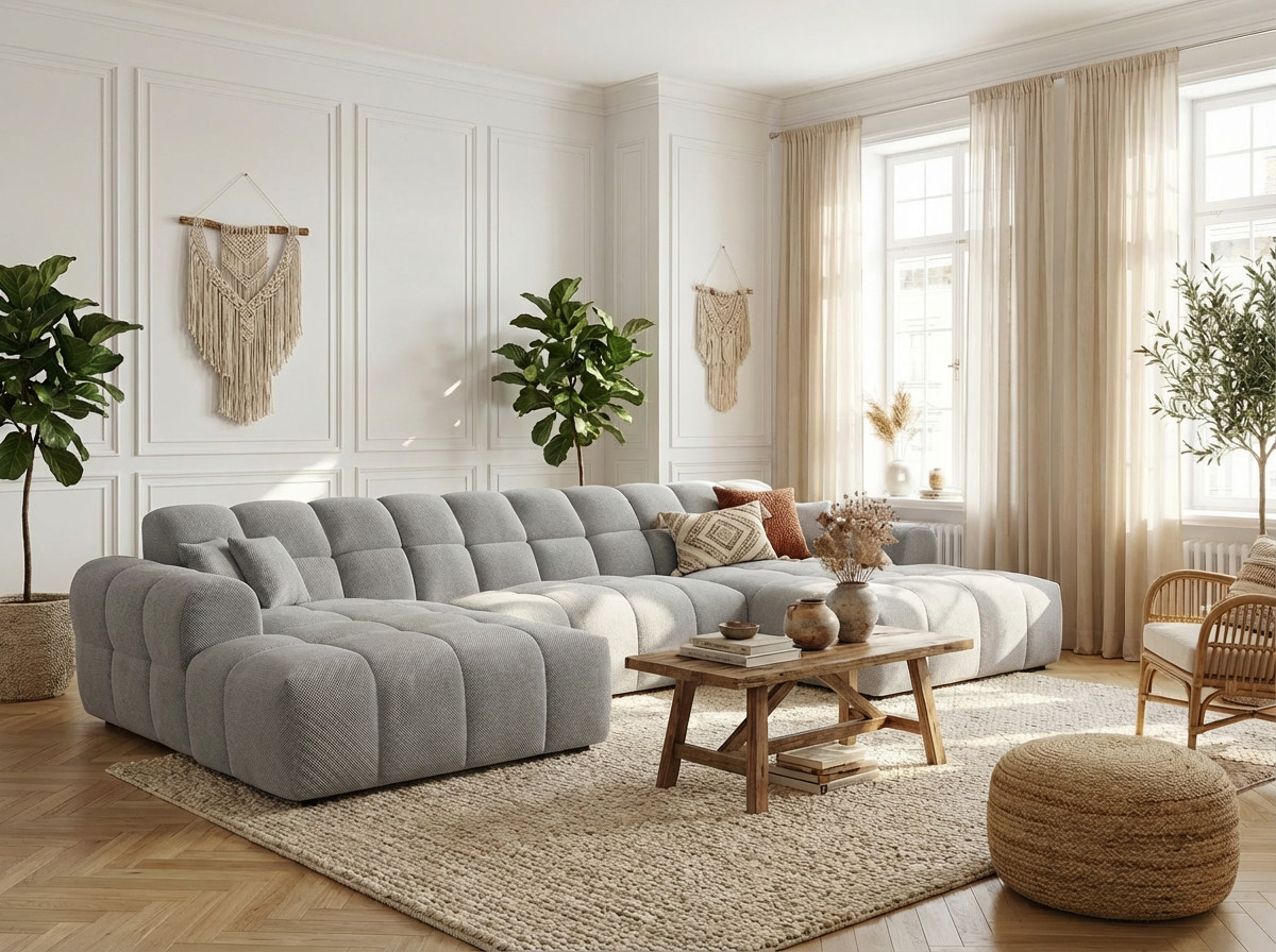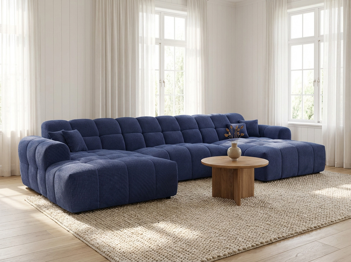 La structure du Roxie repose sur une conception robuste en MDF et panneaux de particules HDF, garantissant une solidité à toute épreuve avec un poids maximal conseillé de 275 kg. Le garnissage de l'assise combine intelligemment mousse polyuréthane haute densité (28 kg/m³) et ressorts ondulés, offrant un soutien ferme et durable. Le dossier bénéficie également d'une mousse polyuréthane HD de 23 kg/m³ pour un maintien optimal du dos. Avec une hauteur d'assise de 40 cm et une profondeur variable de 58 à 120 cm, ce canapé en U accueille confortablement 3 personnes et plus, idéal pour les moments conviviaux en famille ou entre amis.