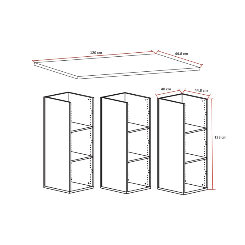 | Matière de la structure | Top et dessous en mélamine 25 mm avec chants ABS 0.8 mm - côtés et fond en mélamine 19 mm avec chants ABS 0.8 mm |