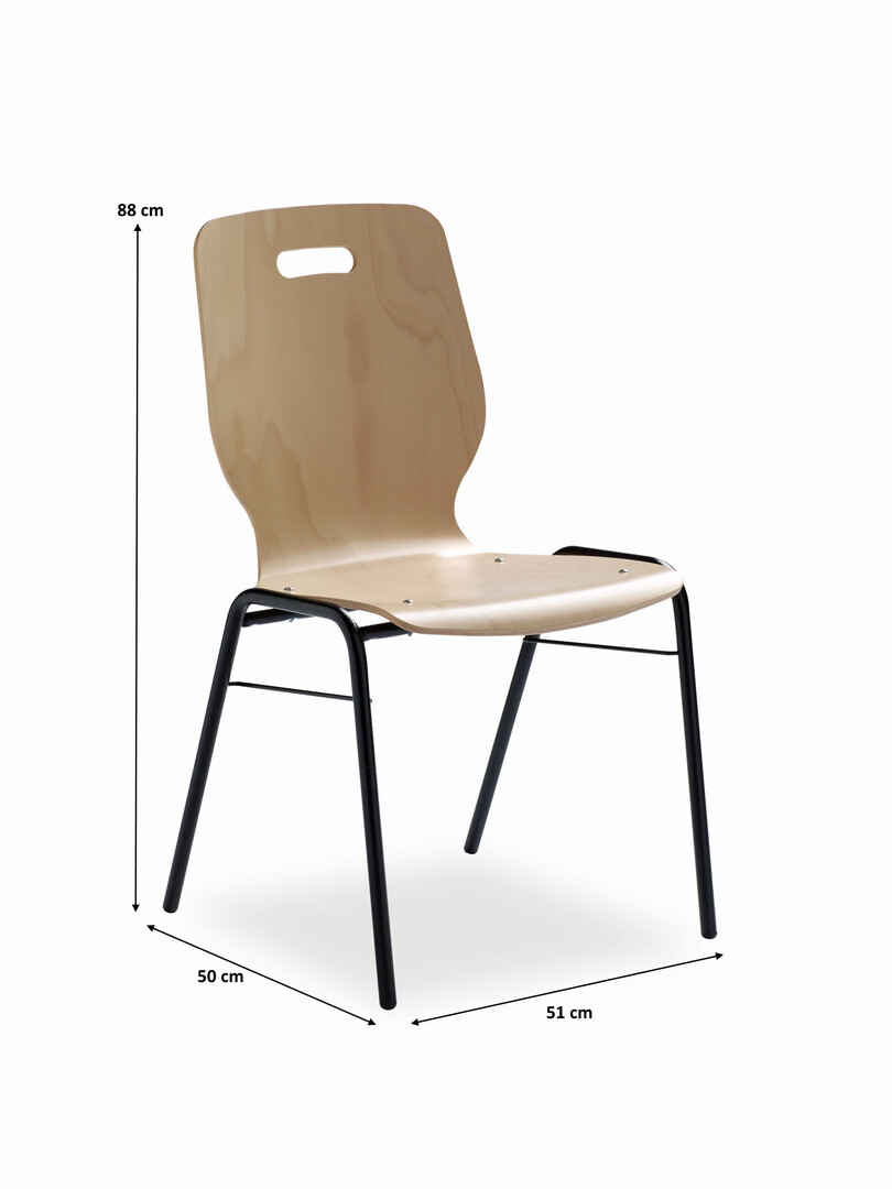 Avec une largeur de 51 cm, une hauteur de 88 cm et une profondeur de 50 cm, cette chaise d'accueil assure un confort optimal pour vos visiteurs. La coque en multiplis de hêtre qualité A/A est conforme à la norme non feu et est composée de 9 plis de placage hêtre déroulé de 12/10mm (épaisseur 10 mm). Les arêtes sont cassées et les chants poncés pour un rendu esthétique parfait. La coque est boulonnée sur le piètement en tube métal Ø 20x1.5mm et 18x1.5mm revêtus d'une peinture époxy noir. Un système d’accrochage et d'empilage en fil diamètre 6 mm facilite son rangement. Les embouts à semelle épaisse à ailettes à insérer assurent une grande stabilité.