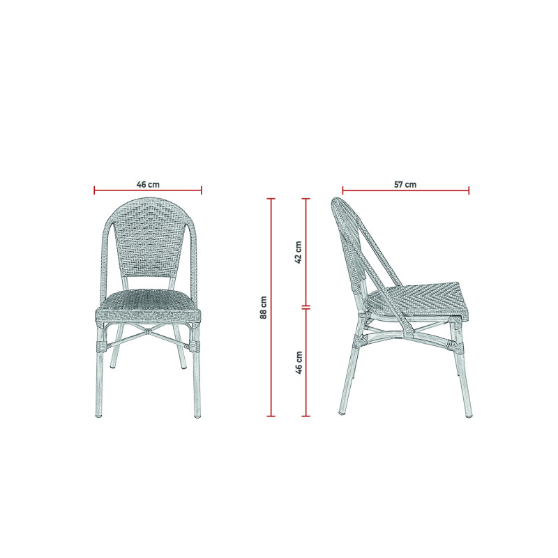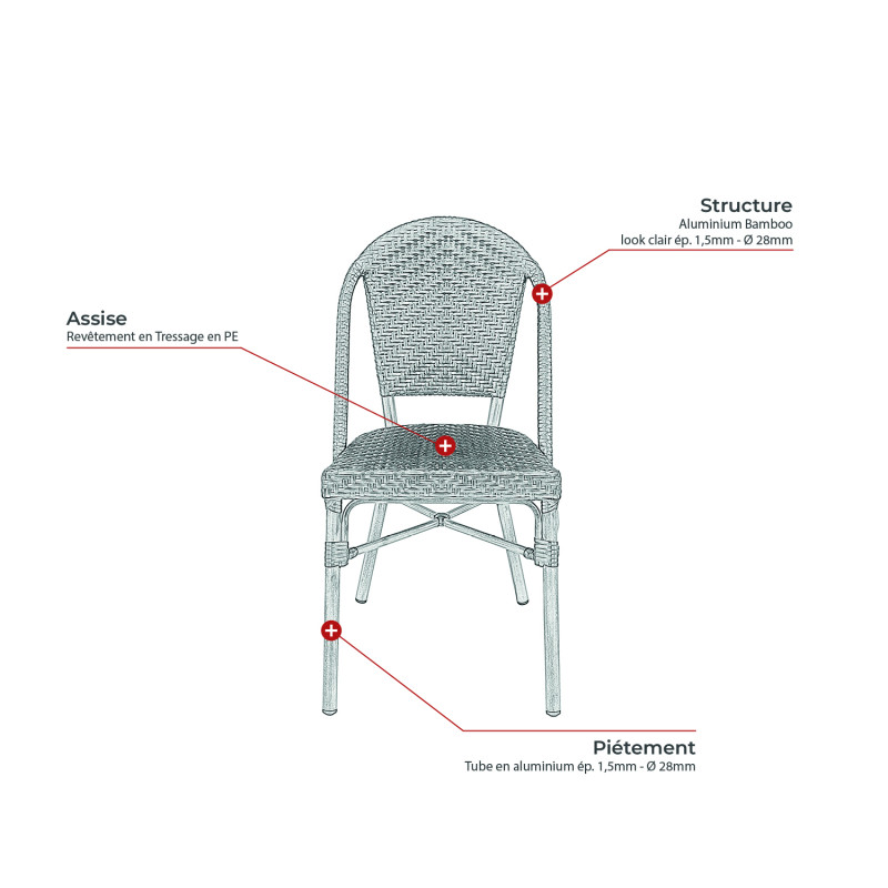 Pensée pour répondre aux besoins du mobilier de restauration, cette chaise garantit une assise stable et confortable, idéale pour accueillir votre clientèle dans les meilleures conditions. Son cadre en aluminium robuste (épaisseur 1,5 mm, diamètre 28 mm) assure une solidité à toute épreuve, tandis que son entretien est simplifié : un simple chiffon humide suffit pour la garder impeccable. Livrée avec une notice claire, son montage est rapide et intuitif.