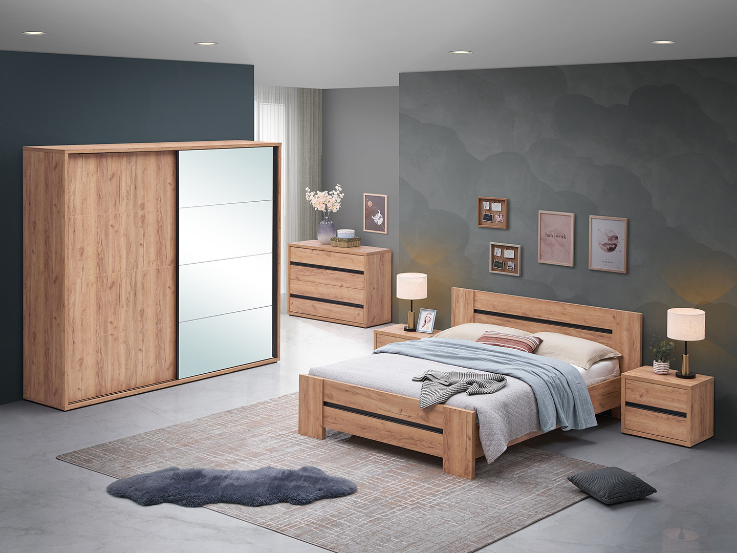 | Nombre d'éléments | une armoire disponible dans 2 dimensions, un lit disponible dans 3 dimensions, une commode et 2 chevets |