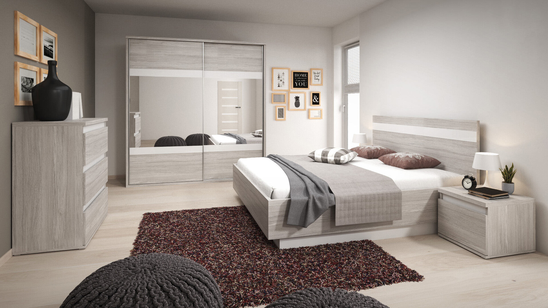 La chambre adulte complète contemporaine Josiane a été conçue dans un style épuré et contemporain. Le coloris chêne clair / chêne blanc rappelle la matière noble du bois. Il apporte un peu de chaleur et de lumière à la chambre. L’ensemble est composé de 5 meubles assortis, fabriqués en Europe, en mélaminé de première qualité.